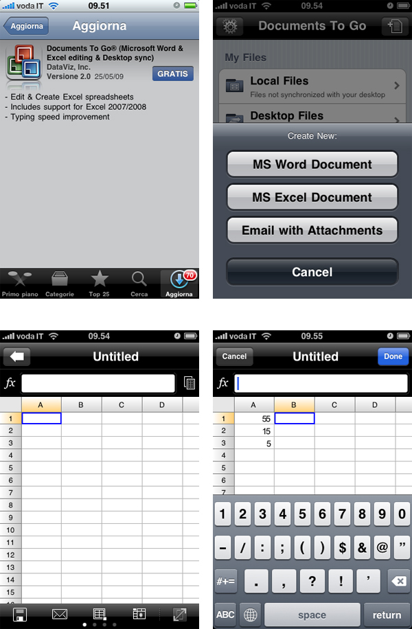 Con la nuova versione 2.0 di Documents To Go per iPhone e touch è ora finalmente possibile creare e modificare anche i file di Excel, con supporto per le versioni 2007 e 2008. Ricordiamo che fin dal lancio su App Store Documents To Go permetteva di memorizzare e visualizzare un ampio numero di documenti in formato diverso, mentre le funzioni avanzate per creare e modificare i file erano supportate solo per i documenti di Word.