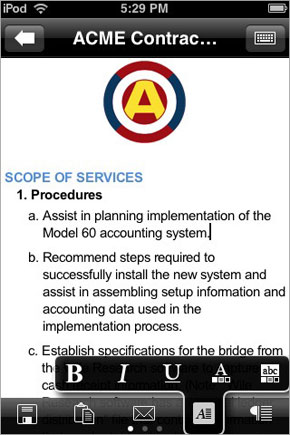 Il supporto offerto per la gestione dei file Word è completo e include anche funzionalità avanzate solitamente non fornite dai programmi per la produttività mobile. Oltre alla visualizzazione è possibile modificare e creare ex novo file di Word inclusa le principali formattazioni del testo, la scelta dell’allineamento elenchi puntati e numerati automatici, gestione delle tabelle e dei grafici, conteggio parole, la funzione cerca e sostituisci e così via. In pratica tutti i comandi e le funzioni principali, anche le più utilizzate sul computer, sono ora a nostra disposizione su iPhone e touch per correggere e creare documenti in ogni luogo.