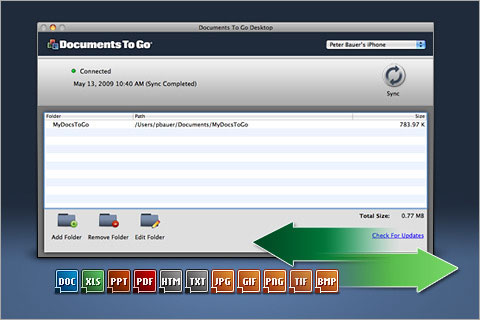 Gli utenti che acquistano Documents To Go per iPhone/touch possono scaricare gratuitamente un applicativo per Mac e PC che funzionando in abbinamento al software per il tascabile permettono di sincronizzare intere cartelle e sotto cartelle di documenti, così come singoli file importanti, per avere sempre sotto mano il materiale più urgente e più utile. I documenti di Word modificati su Mac o tascabile vengono automaticamente sincronizzati via Wi-Fi per avere la certezza di lavorare sempre sull’ultima versione. Oltre a questo Documents To Go permette di visualizzare praticamente tutti i principali documenti memorizzati nei formati più diffusi, non solo per Word, ma anche fogli di lavoro Excel, presentazioni PowerPoint e anche i file creati con iWork ’08.