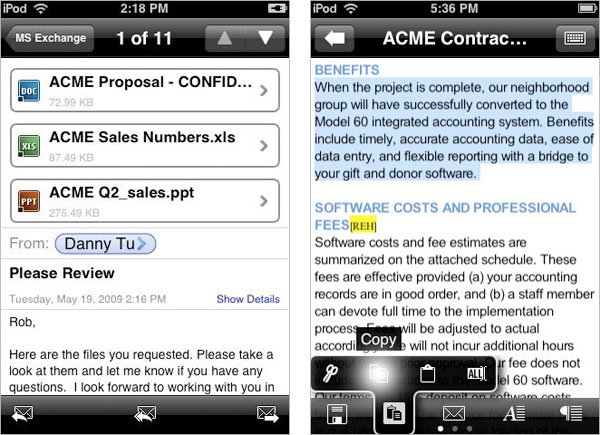 Documents To Go senza il supporto allegati per Microsoft Exchange è disponibile su App Store a 3,99 euro. Con la versione professionale proposta a 7,99 euro è possibile inviare e ricevere qualsiasi documento nei formati supportati. Oltre a memorizzare e visualizzare i documenti allegati alle email, a seconda del tipo di file è possibile anche modificarne i contenuti.
