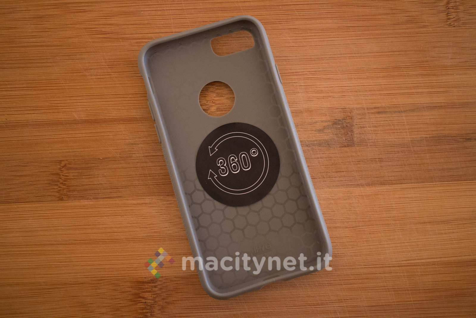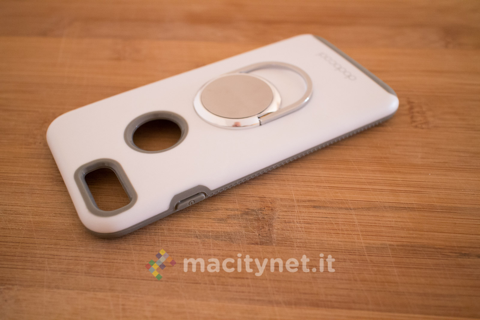 La custodia protegge lo smartphone molto più di altre più comuni specialmente ai bordi, dove appare molto robusta. Il punto di forza è ovviamente nella piastra metallica con gancio sul retro, il quale funge da maniglia e cavalletto.