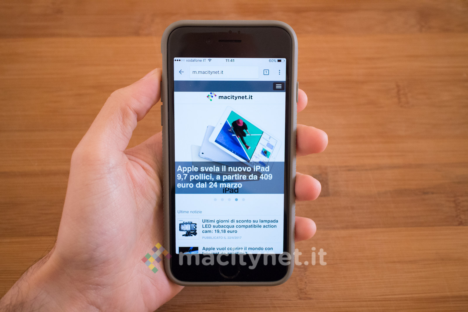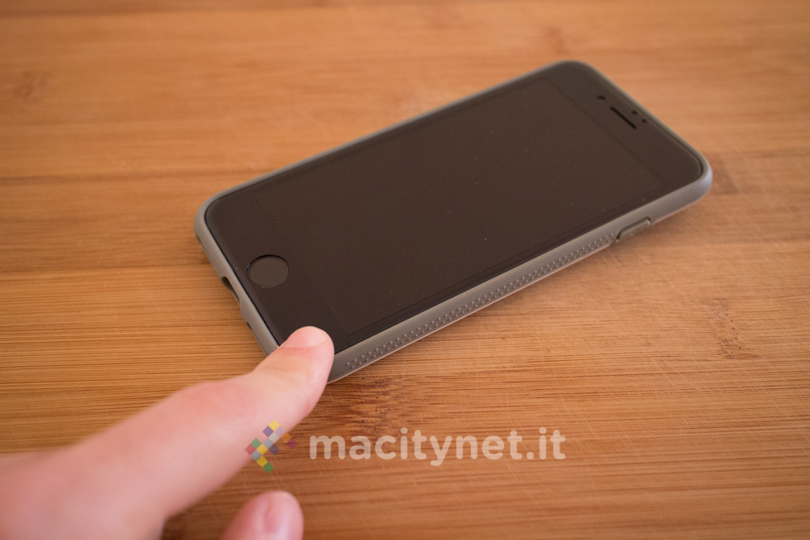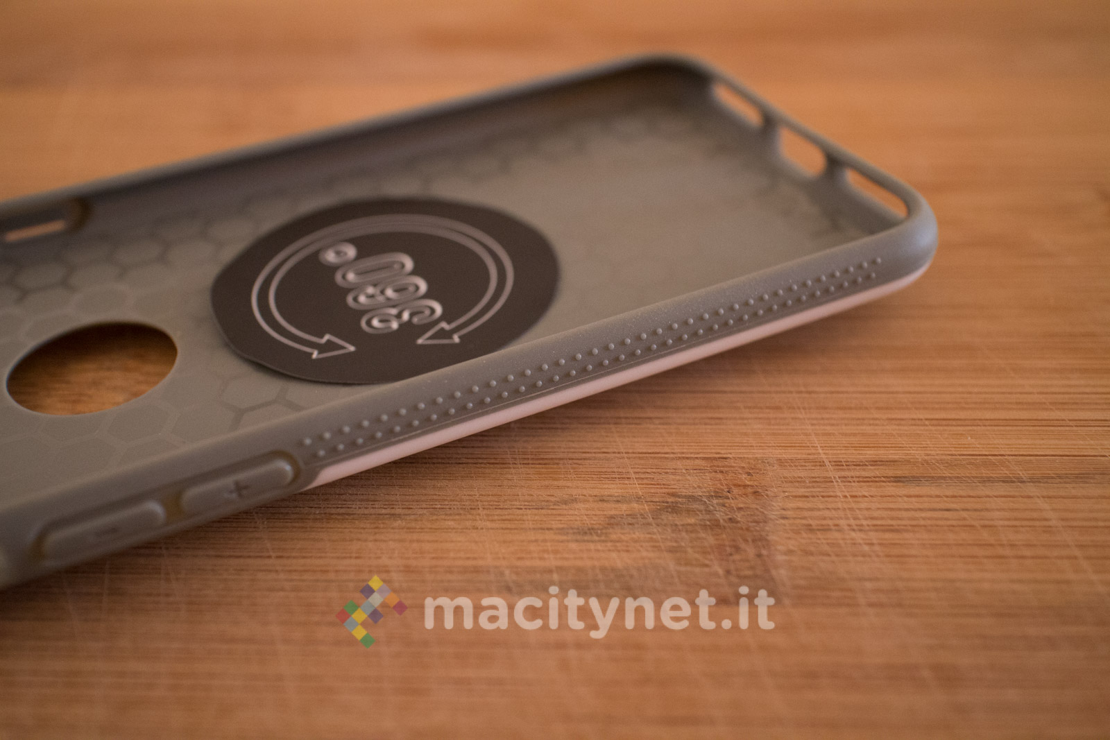 Il dorso della custodia, nel nostro caso di colore bianco (c’è anche la versione nera), è in TPU abbastanza flessibile. La seconda metà della custodia (in grigio) è invece in morbido silicone, che si flette maggiormente in prossimità di porte e pulsanti che, nel caso di Volume e Standby, sono completamente protetti. Oltre all’apertura dedicata a presa Lightning, microfono, altoparlante, tasto Mute e fotocamera posteriore, troviamo un foro sul retro che lascia respirare il logo Apple dell’iPhone, una scelta puramente stilistica e che non offre in realtà alcun vantaggio.