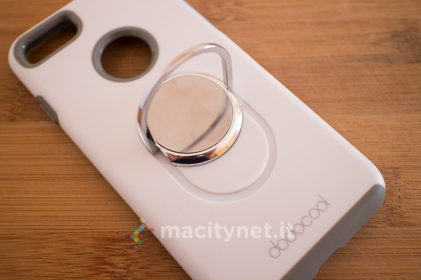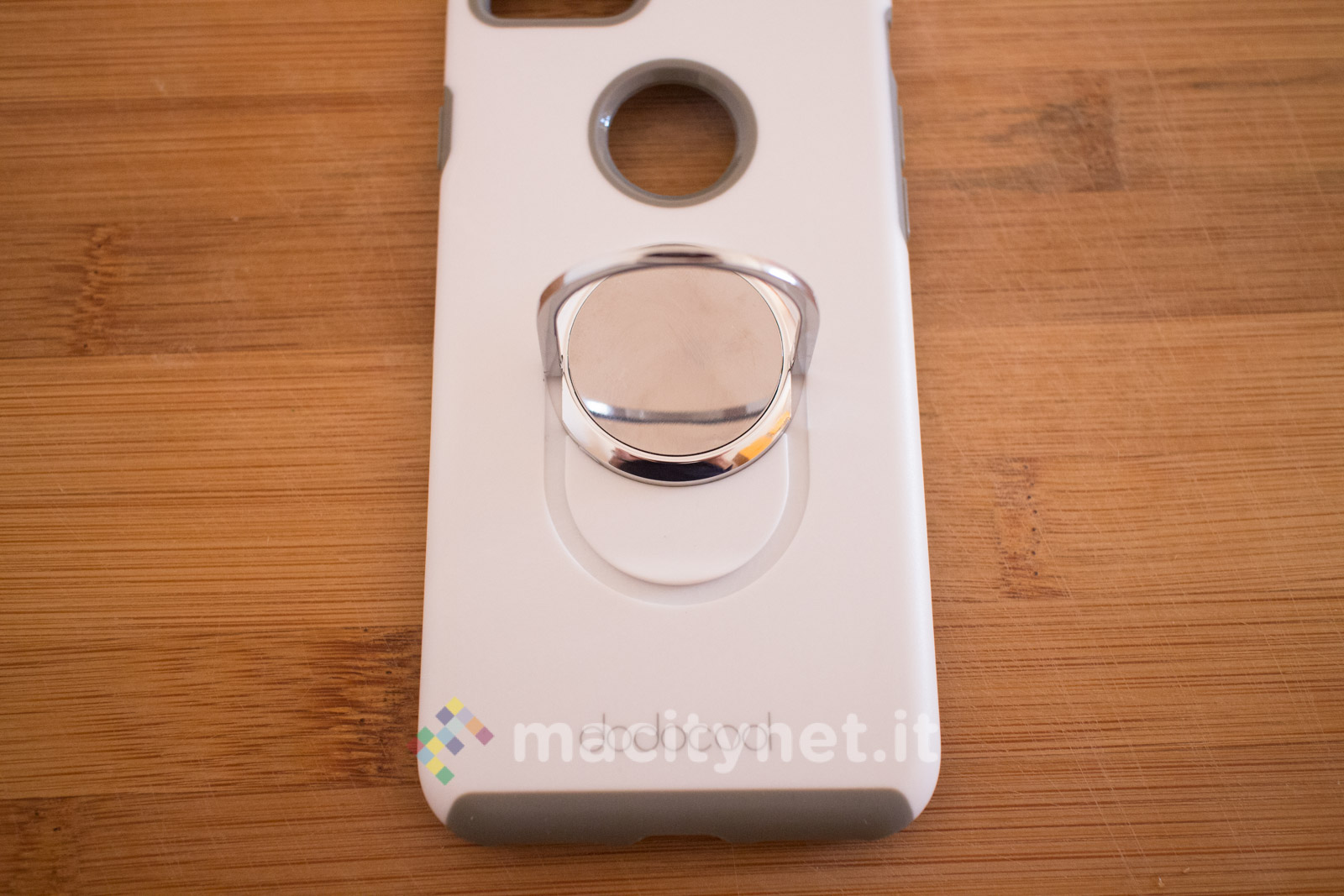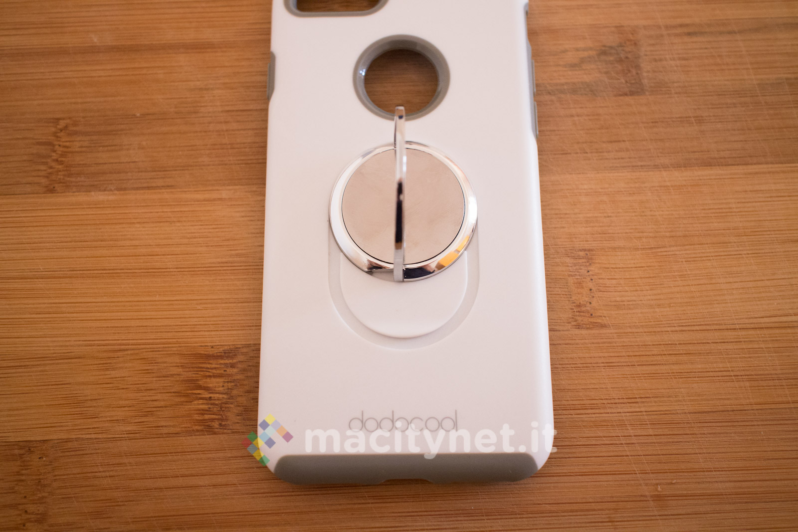 Normalmente le custodie si limitano a proteggere lo smartphone da urti, graffi e cadute, ma Dodocool DA116 fa molto di più: grazie ad un anello sul dorso permette di mantenere il telefono inclinato in orizzontale e in verticale su un piano d’appoggio, inoltre ne migliora la presa con una mano e grazie alla piastra metallica facilita l’aggancio dello smartphone a qualsiasi supporto magnetico senza l’ausilio di piastrine mobili.