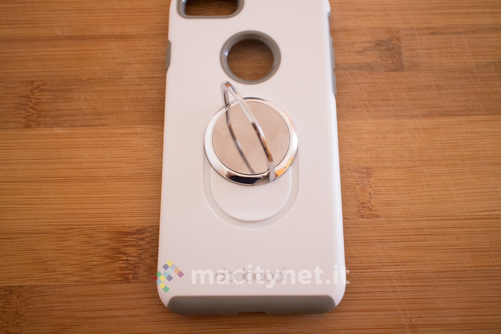 Il gancio ha inoltre un’apertura sufficientemente ampia (3.5 x 2.8 cm) per far spazio al dito di una mano: ciò, insieme alla possibilità di orientarlo anche in diagonale, permette di sfruttarlo durante l’uso del telefono con una sola mano ed evitare così che possa scivolare per una distrazione.
