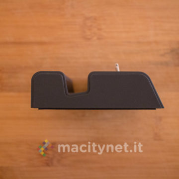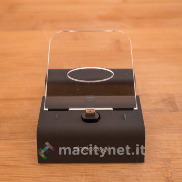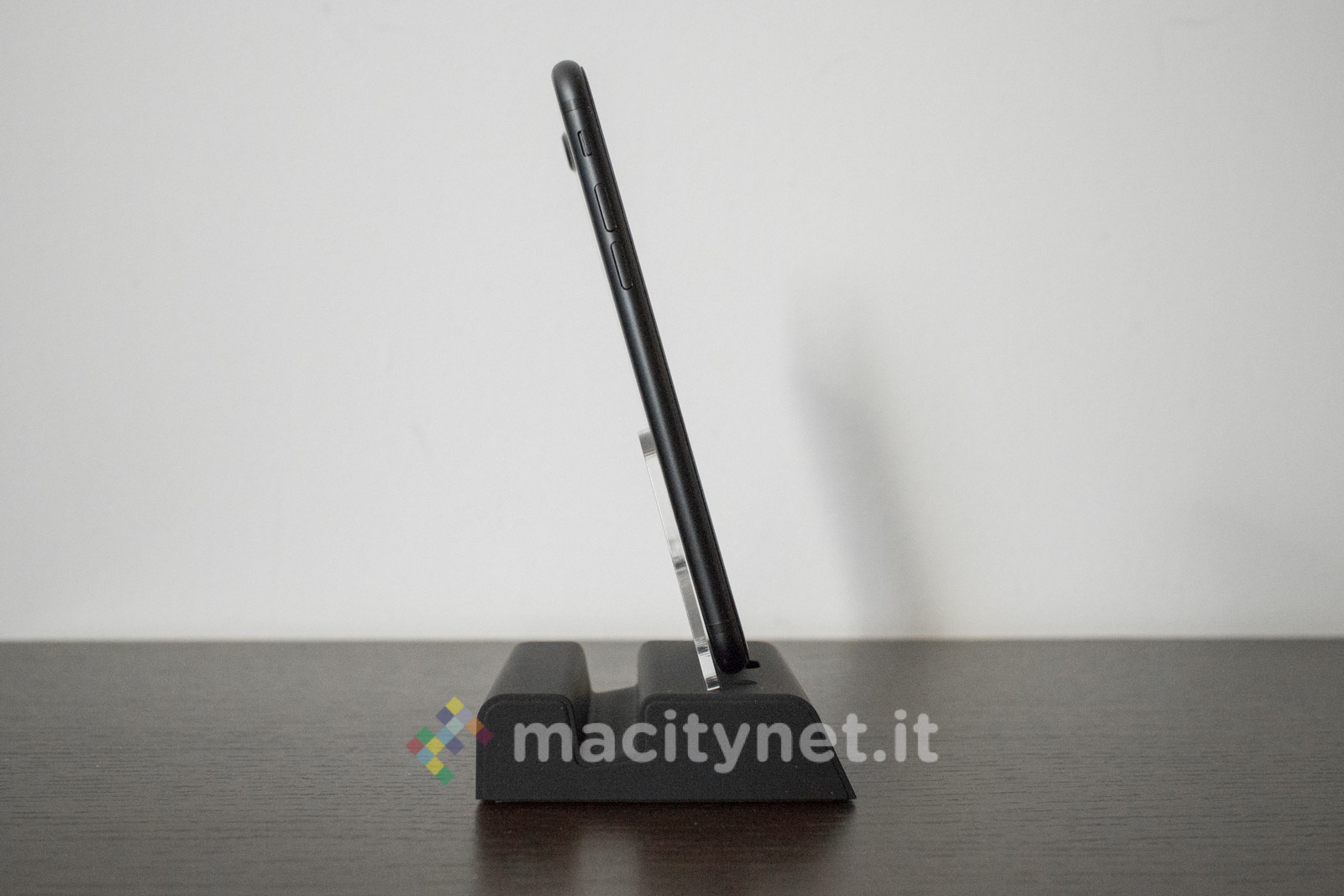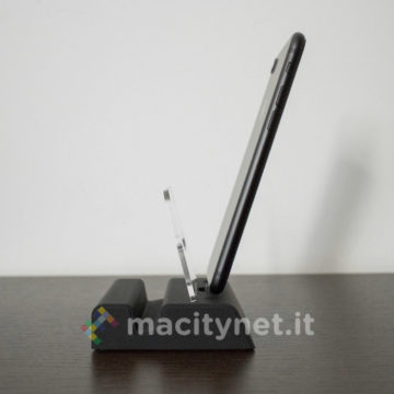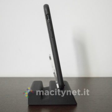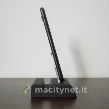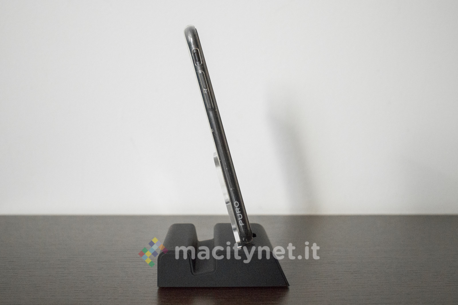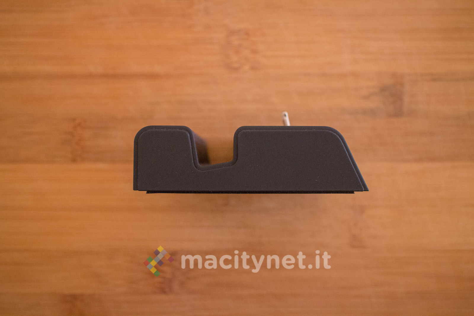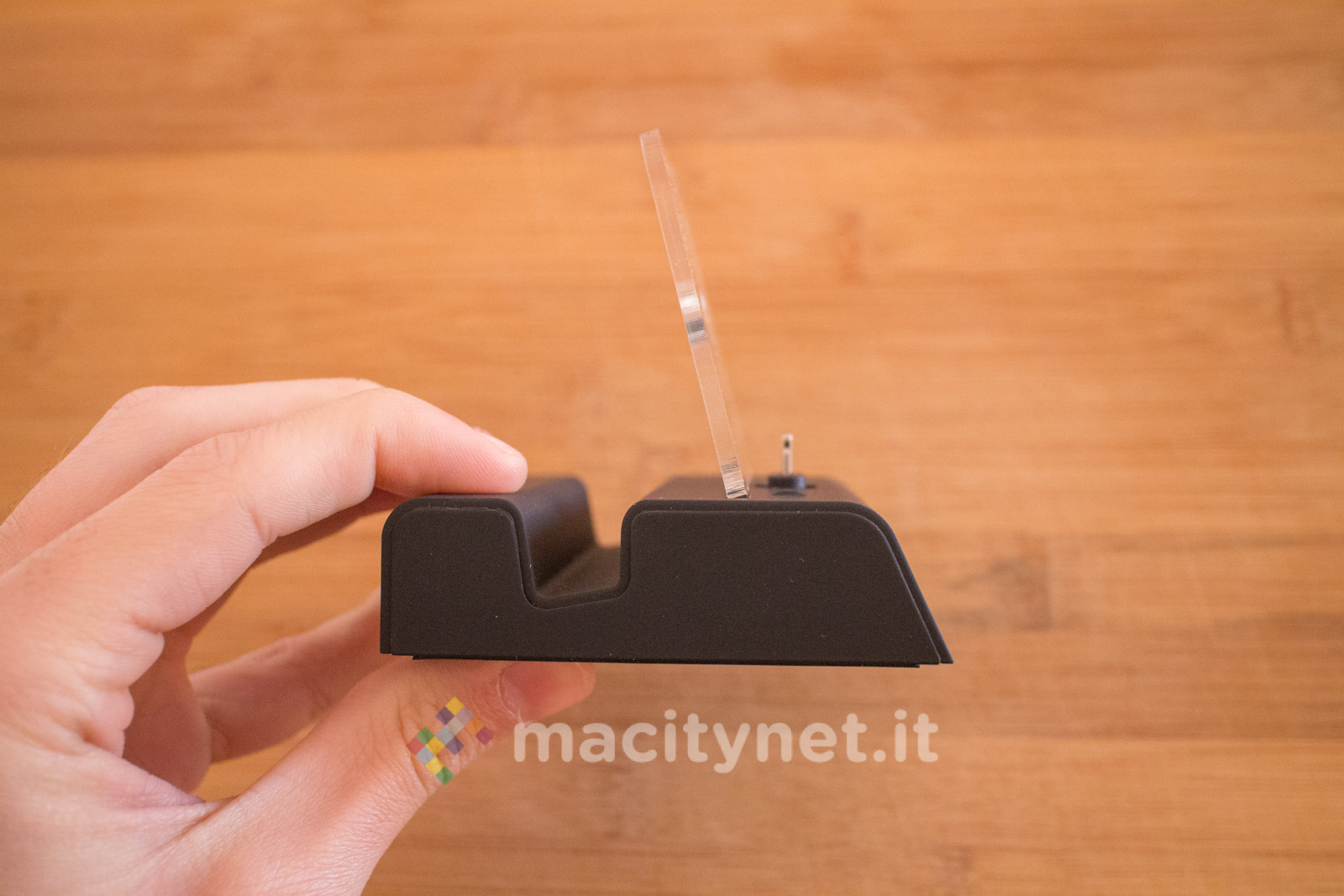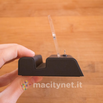 Sul bordo superiore della base spunta il connettore Lightning, certificato MFI, caratterizzato da un sistema che lo rende piuttosto mobile e facile da adattare a qualsiasi iPhone, anche con custodia al seguito. Ci sono poi due fessure per incastrare la placca removibile ed un’apertura più ampia (1.1 cm) dove è possibile eventualmente appoggiare anche un iPad, magari in ricarica sfruttando un qualsiasi cavo che abbiamo in casa.