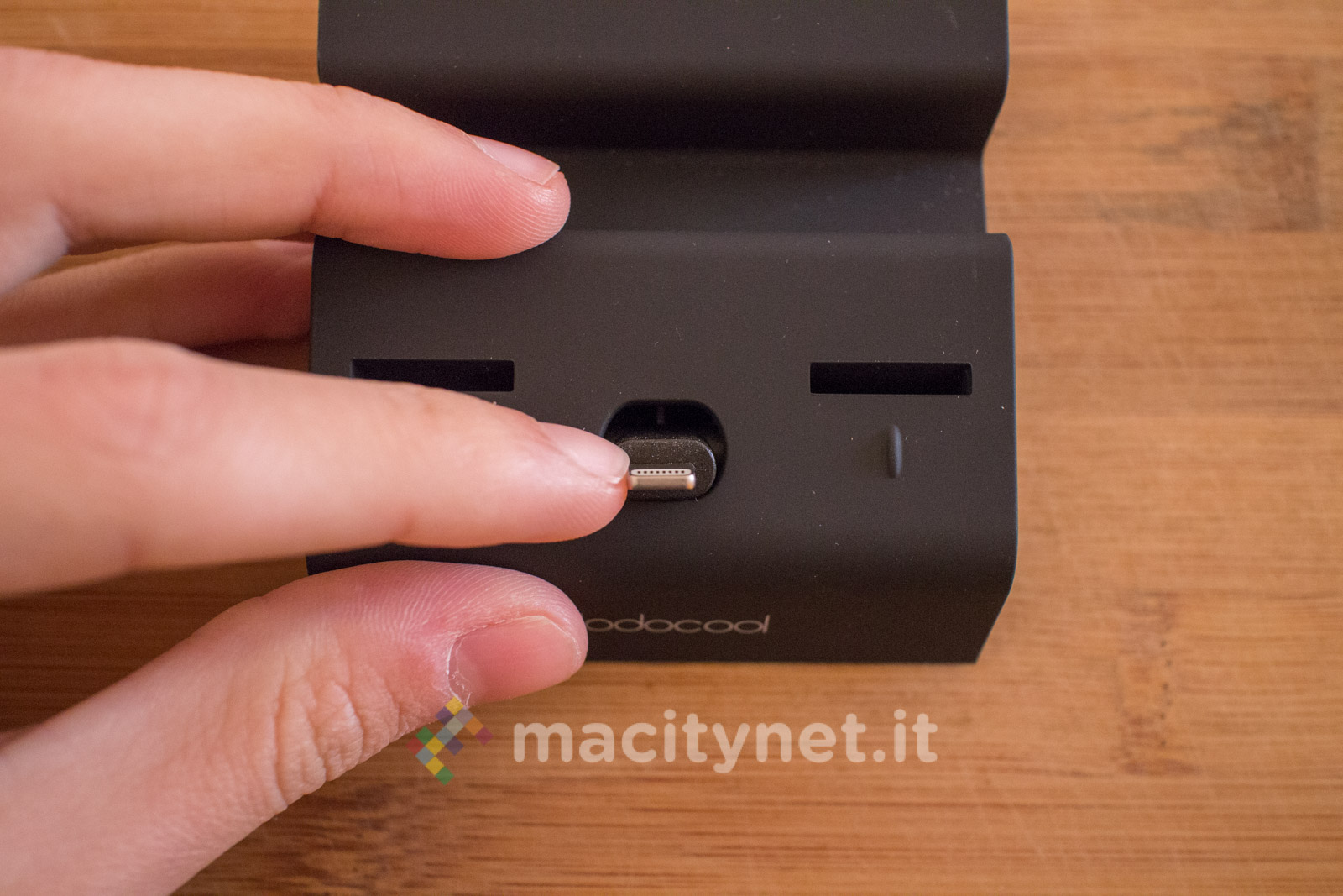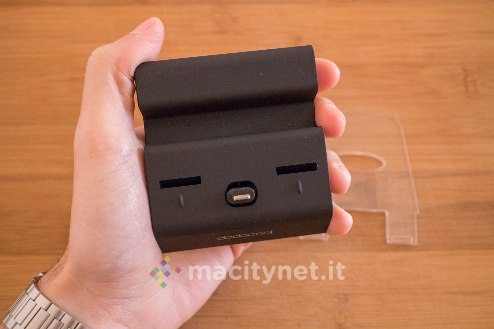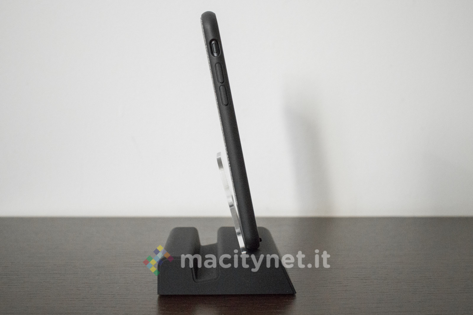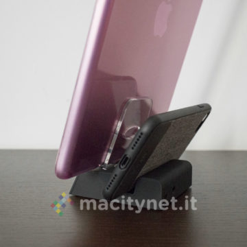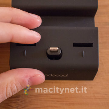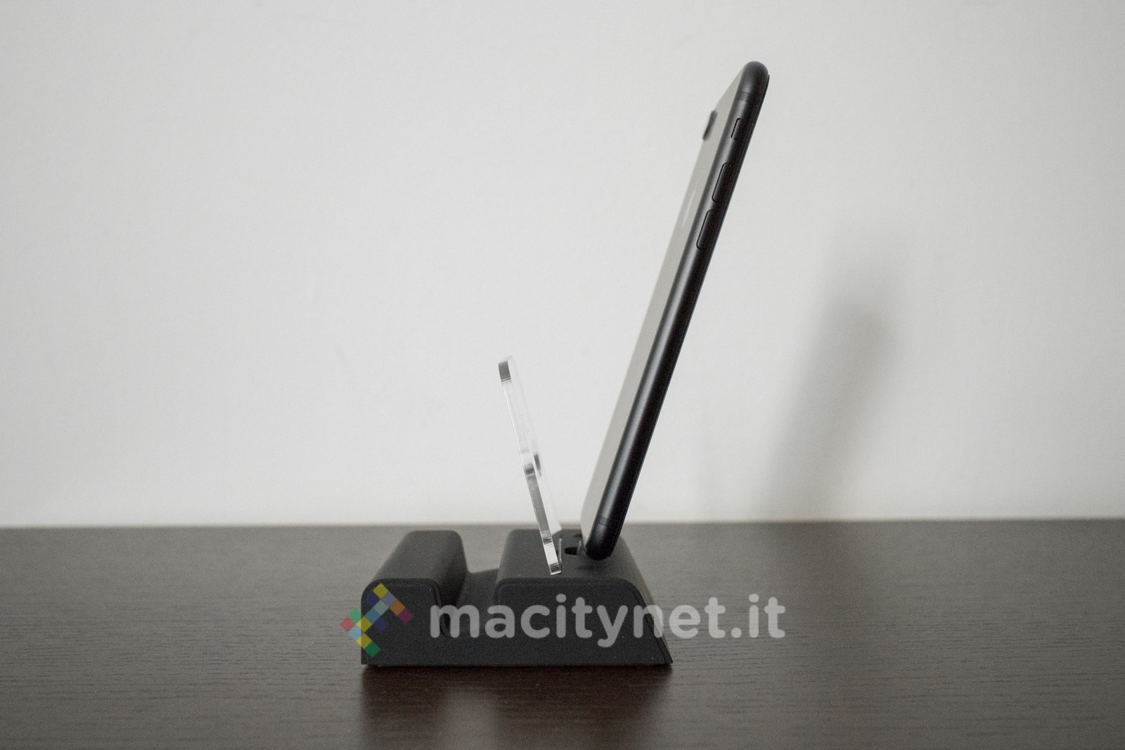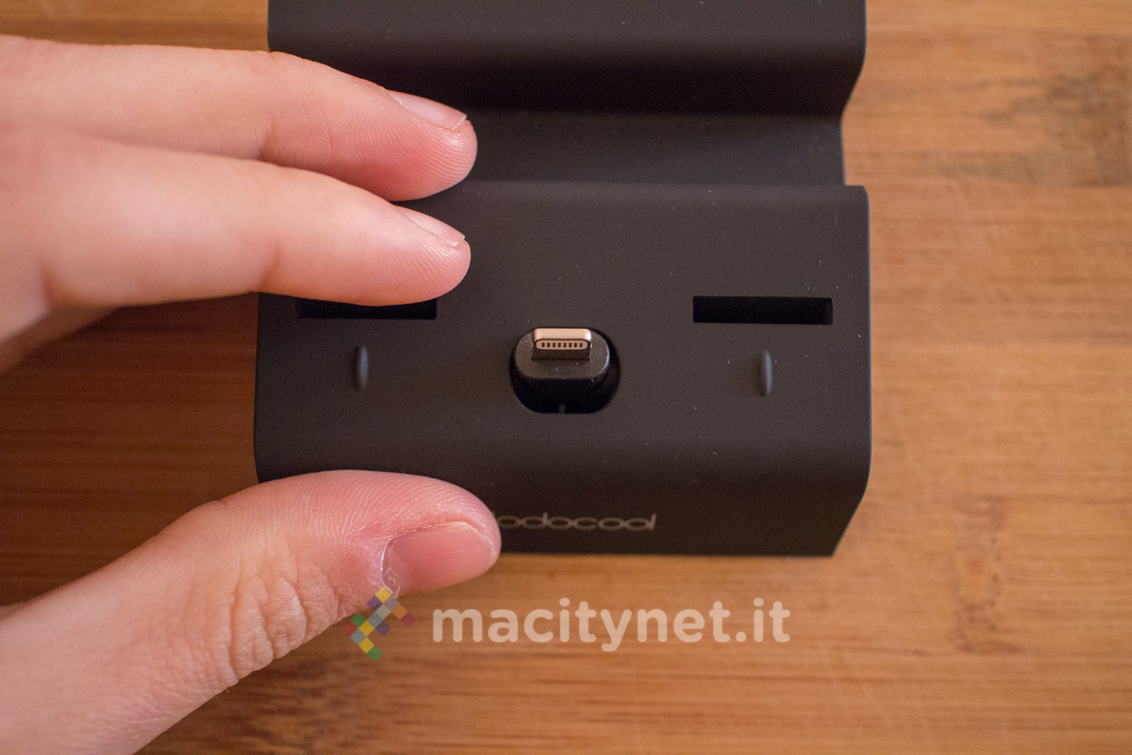 Sul bordo superiore della base spunta il connettore Lightning, certificato MFI, caratterizzato da un sistema che lo rende piuttosto mobile e facile da adattare a qualsiasi iPhone, anche con custodia al seguito. Ci sono poi due fessure per incastrare la placca removibile ed un’apertura più ampia (1.1 cm) dove è possibile eventualmente appoggiare anche un iPad, magari in ricarica sfruttando un qualsiasi cavo che abbiamo in casa.