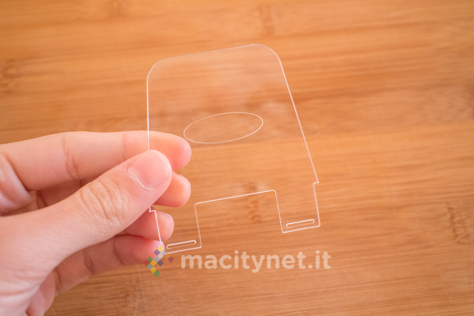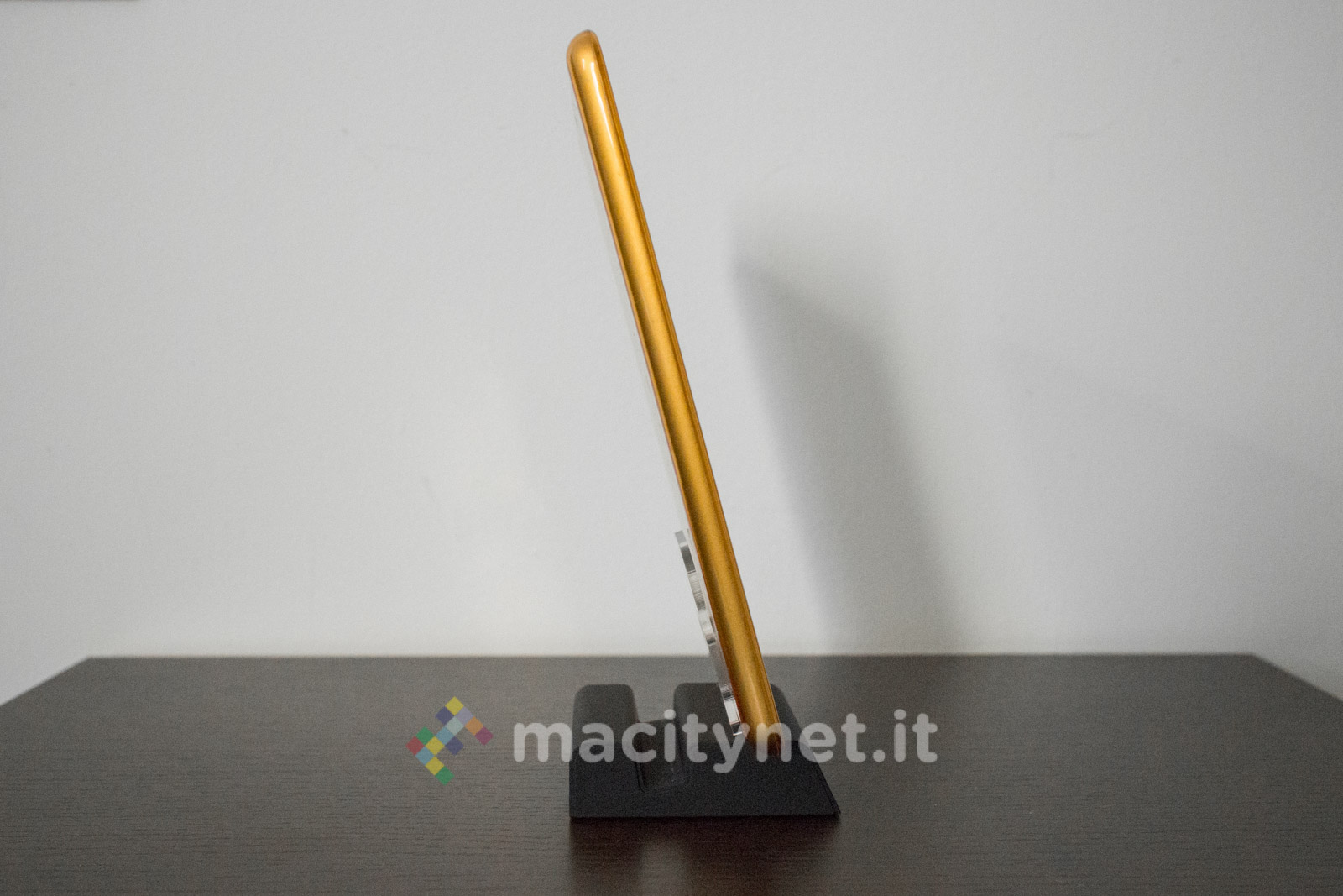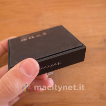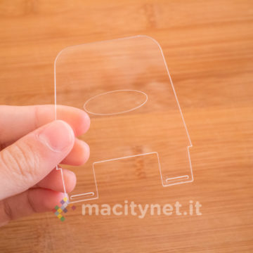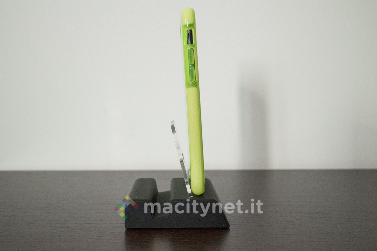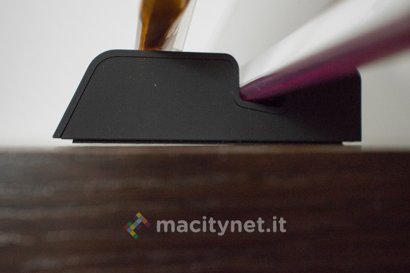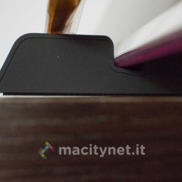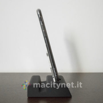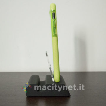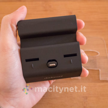 Sul bordo superiore della base spunta il connettore Lightning, certificato MFI, caratterizzato da un sistema che lo rende piuttosto mobile e facile da adattare a qualsiasi iPhone, anche con custodia al seguito. Ci sono poi due fessure per incastrare la placca removibile ed un’apertura più ampia (1.1 cm) dove è possibile eventualmente appoggiare anche un iPad, magari in ricarica sfruttando un qualsiasi cavo che abbiamo in casa.