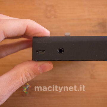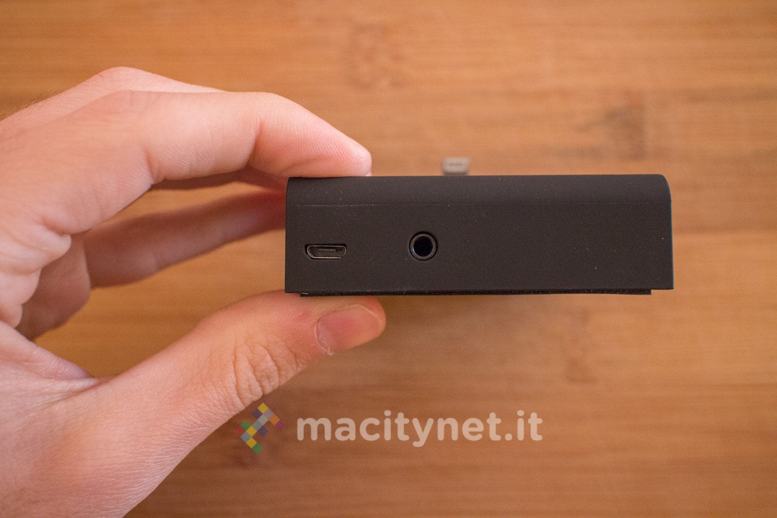 Il fondo della base è completamente rivestito da uno strato in gomma spesso pochi millimetri che assicura un’ottima aderenza anche sulle superfici più lisce. Sul bordo posteriore troviamo invece due prese, una microUSB per il collegamento del relativo cavo incluso in confezione all’apposito alimentatore ed una jack da 3.5mm per il collegamento via cavo ad uno stereo o una cassa Bluetooth.