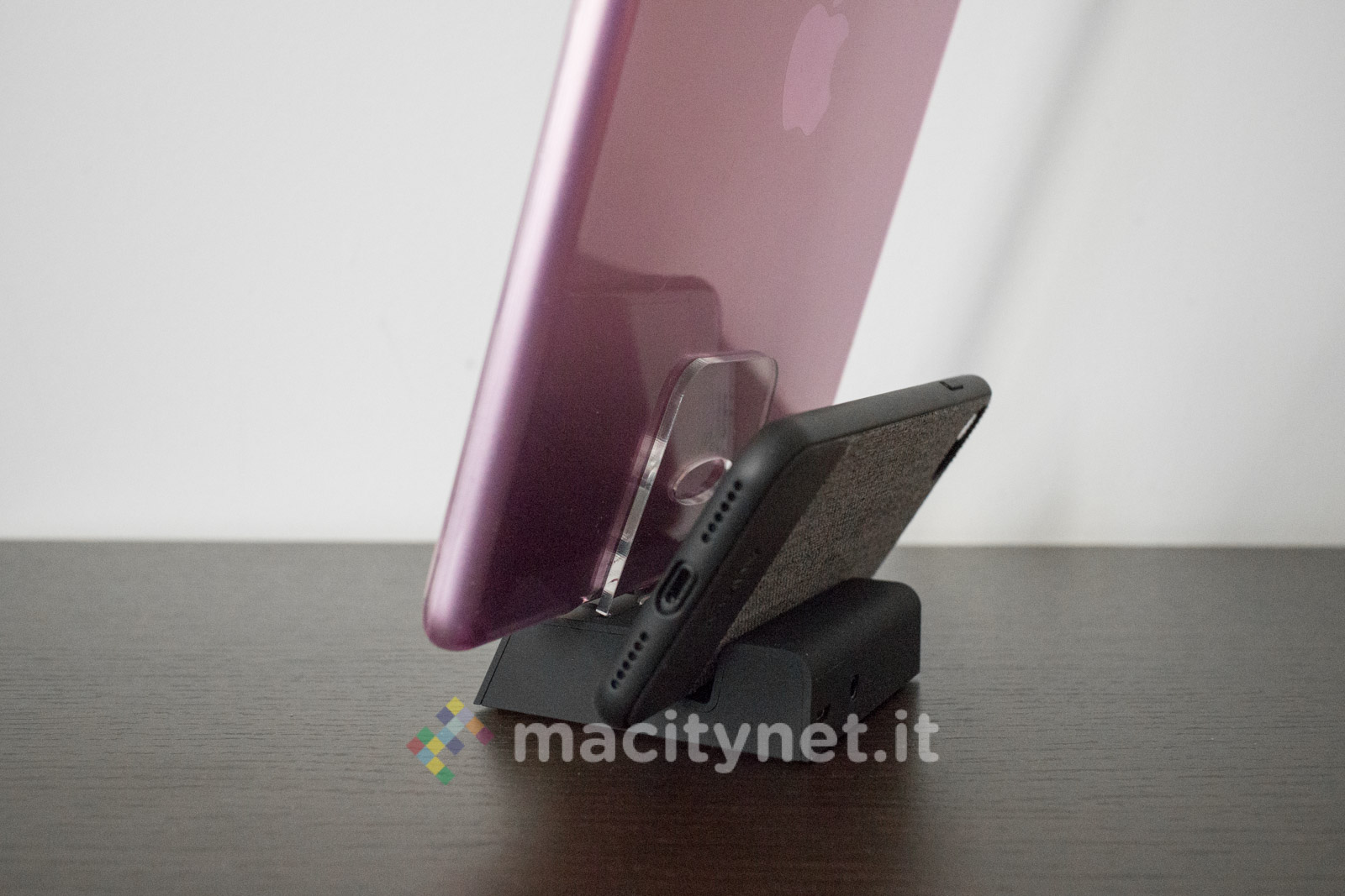 Abbiamo fatto diverse prove con iPhone 7, iPad mini 3 e iPad Air 1, con e senza custodia, constatando che anche con la cover per iPhone più ingombrante (una di quelle shockproof) il supporto assicura piena compatibilità nel collegamento attraverso la presa Lightning incorporata, sebbene il telefono risulti inclinato quasi in verticale in quanto i maggiori ingombri non permettono al dispositivo di poggiare il dorso sulla placca removibile. Ad essere precisi soltanto con le custodie ultrasottili (oltre che con l’iPhone senza alcuna cover) il dispositivo poggia completamente sul supporto.