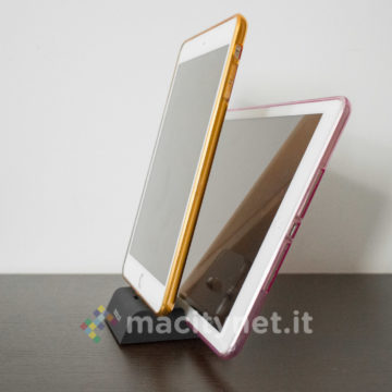 Con iPhone davanti e iPad mini dietro non ci sono problemi, ma se al posto di quest’ultimo posizioniamo un più pesante iPad il supporto inevitabilmente si inclinerà. In casi come questo può valere la pena invertire le posizioni, sfruttando la presa Lightning frontale per la ricarica di iPhone e posizionando invece sul retro l’iPhone.