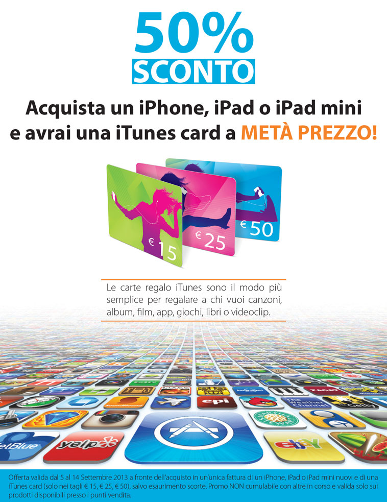 Con la prima promozione è possibile acquistare iTunes Card con il 50% di sconto se abbinata con l’acquisto di iPhone, iPad o iPad mini. Per chi sta valutando l’acquisto di uno di questi dispositivi iOS di Apple, con questa promozione Juice è possibile ottenere credito da spendere su iTunes Store a metà prezzo, subito utilizzabile per acquistare app, giochi, musica ma anche software per Mac, film e libri ebook.
