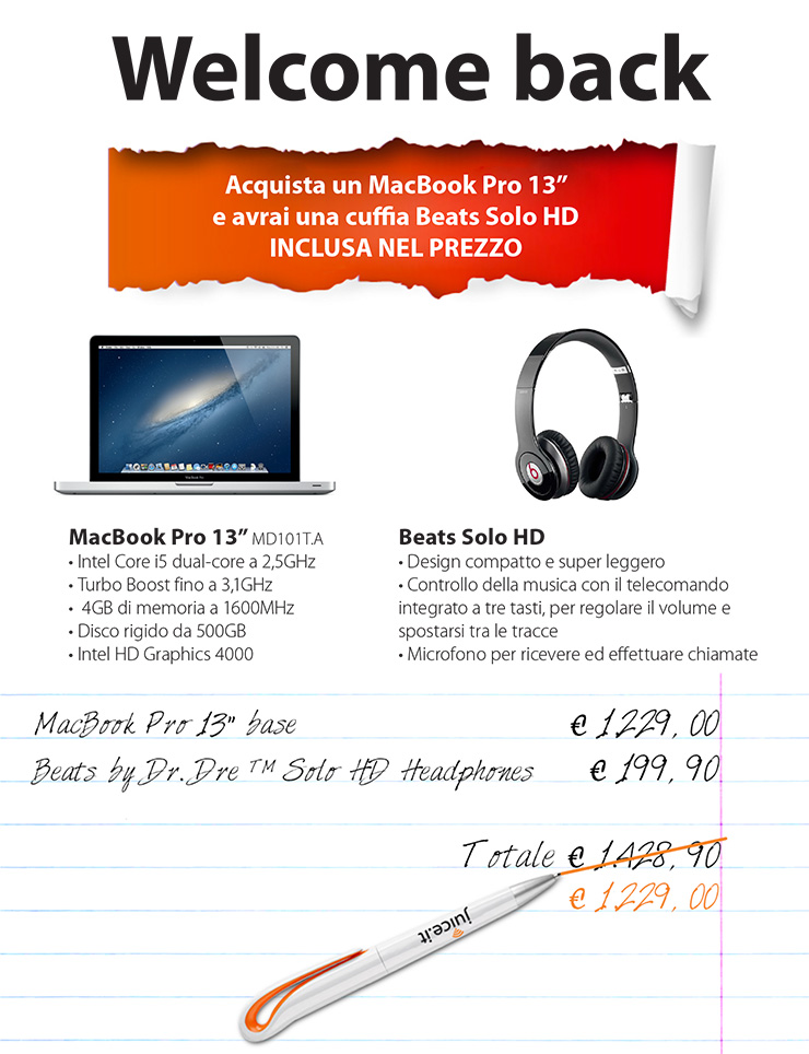Con la seconda promozione invece chi deve acquistare un nuovo portatile Apple riceve in regalo le gettonatissime cuffie Beats Solo HD. La promozione è valida per l’acquisto di un MacBook Pro base da 13 pollici: invece del prezzo complessivo di 1.428 euro per portatile e cuffie, nei negozi Juice il prezzo da corrispondere rimane solo quello del portatile, pari a 1.229 euro. Un regalo del valore di 200 euro circa perfetto per ascoltare musica con il nuovo Mac e con tutti gli altri dispositivi Apple ma anche per guardare film, giocare e telefonare con iPhone grazi al microfono e ai comandi integrati nel filocomando.