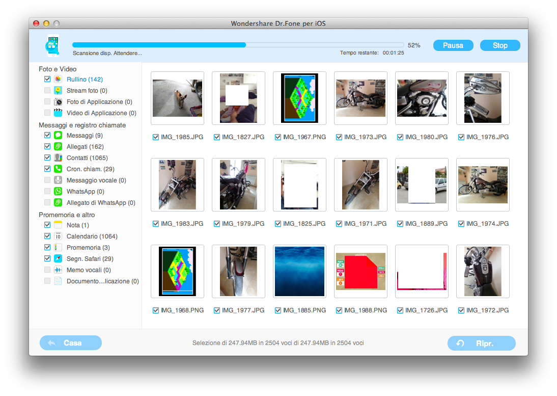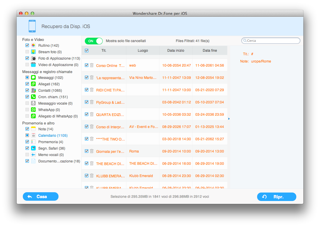 Nella colonna di sinistra è, infatti, possibile prendere subito visione dell’intero contenuto di iPhone o iPad, Foto e video, di messaggi, allegati, contatti, cronologia chiamate, messaggi vocali, messaggi whatsapp e allegati di whatsapp. Inoltre, sempre sulla stessa colonna di sinistra sarà possibile prendere visione dei promemoria inseriti all’interno di note, calendario, segnalibri Safari e memo vocali. Cliccando su ciascuna di queste voci verranno mostrati i dati rinvenuti da Dr. Fone, sia quelli ancora presenti sul terminale, sia quelli effettivamente cancellati, evidenziati in arancione. Ad eccezione delle fotografie, per tutte le altre tipologie di file è possibile decidere se visualizzare, o meno, soltanto i dati cancellati. Quest’ultima opzione risulta particolarmente comoda per individuare immediatamente soltanto i dati di proprio interesse da ripristinare. Dopo aver individuato le informazioni da ripristinare è possibile cliccare sul pulsante Ripr presente in ciascuna schermata sulla parte in basso a destra. A questo punto Dr. Fone creerà sul proprio Mac tante cartelle contenenti tutti i dati ripristinati, suddivisi per categoria. Le foto e in generale gli allegati multimediali possono essere aperti su Mac con una qualsiasi applicazione multimediale, come ad esempio Anteprima per le immagini. I messaggi, invece, verranno salvati in formato HTML o CSV, mentre i contatti in formato CSV o VCF, così da poterli sincronizzare nuovamente sul dispositivo. Anche per calendario, note e promemoria viene generato su HDD un file HTML da poter visualizzare con qualsiasi browser.