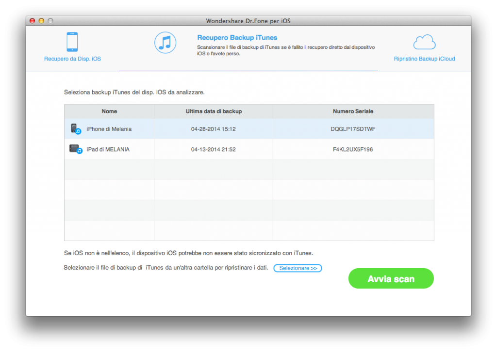 Nel caso in cui, invece, il dispositivo fosse andato smarrito, Dr. Fone consente di ripristinare dati dall’ultimo backup iTunes creato. In questo caso, ovviamente, non è necessario collegare alcun dispositivo al proprio Mac, dato che l’applicativo reperirà automaticamente i file di backup in precedenza creati con iTunes. Allo stesso modo, l’applicativo consente di effettuare l’accesso con le proprie credenziali iCloud e ripristinare backup dalla nuvola di Apple. La schermata di recupero dati, una volta effettuata la scansione dei backup iCloud e iTumes è la medesima del ripristino dati diretto da dispositivo.