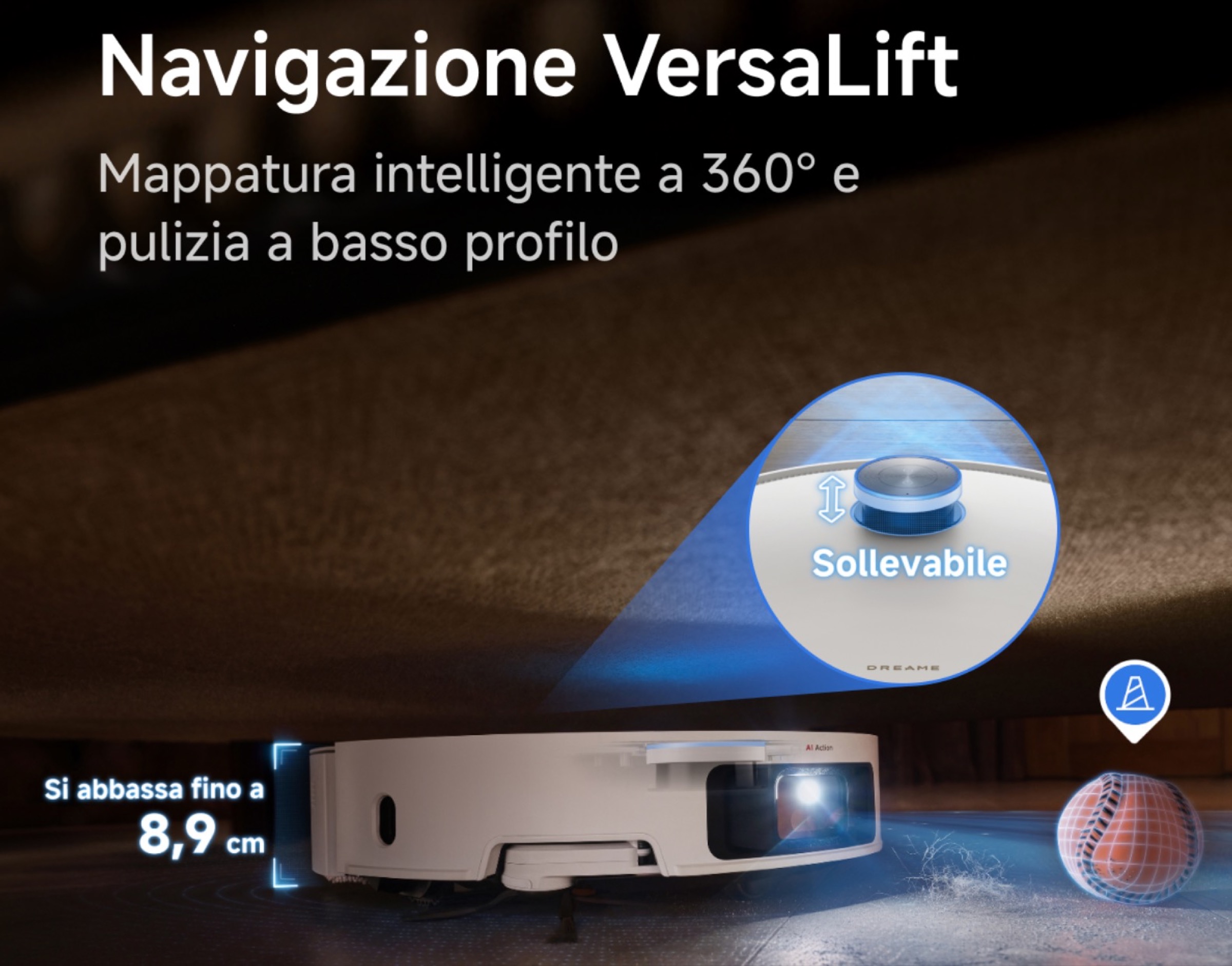 Nuova anche la navigazione VersaLift che si avvale di un sensore DToF (Time of Flight) per abbassare il robot fino a soli 8,9 cm e far sì che possa così accedere facilmente a spazi ristretti come quelli presenti sotto i mobili bassi.