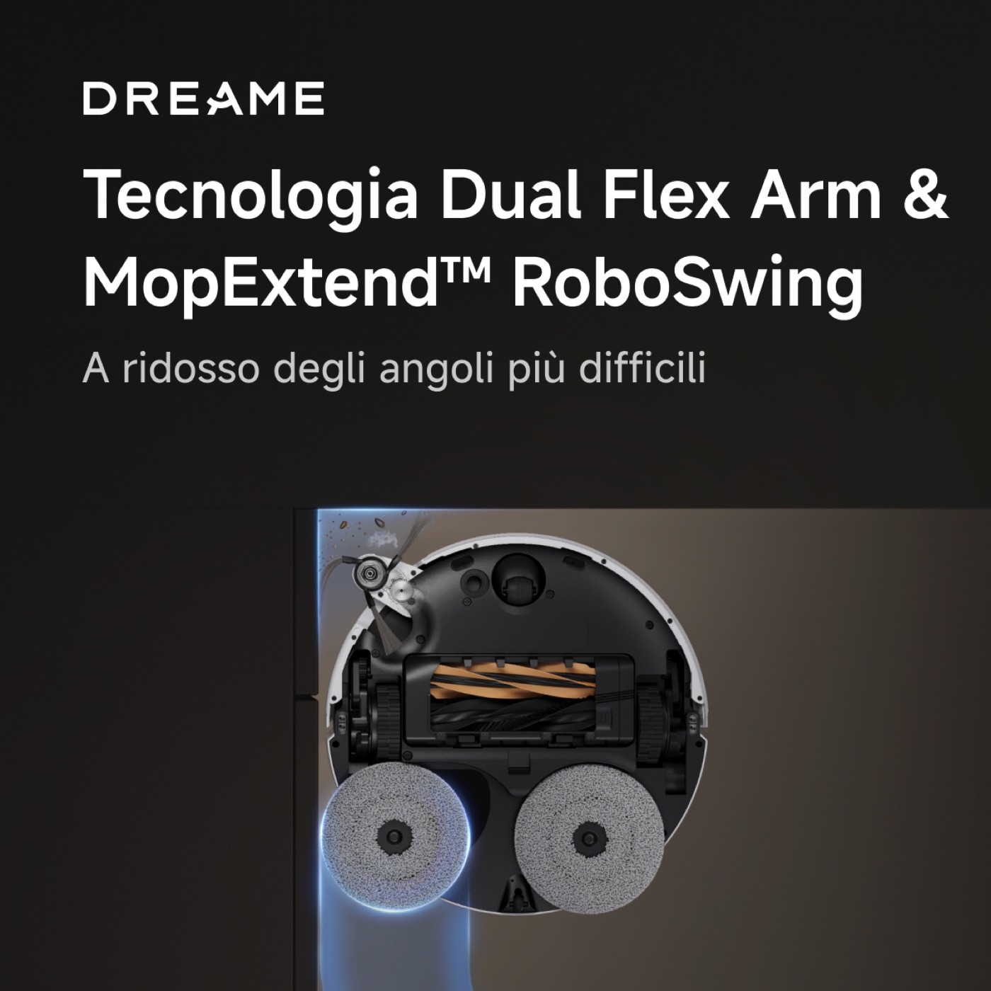 In combinazione con una telecamera AI e una guida a LED, il sistema naviga con precisione negli angoli stretti e bui, offrendo prestazioni di pulizia ottimali in aree precedentemente difficili da raggiungere ma in realtà vengono aggiunte due estensioni Dual Flex Arm: una spazzola laterale estensibile e pure un mocio che si estende per arrivare fino ai battiscopa e risolvere il problema degli angoli.