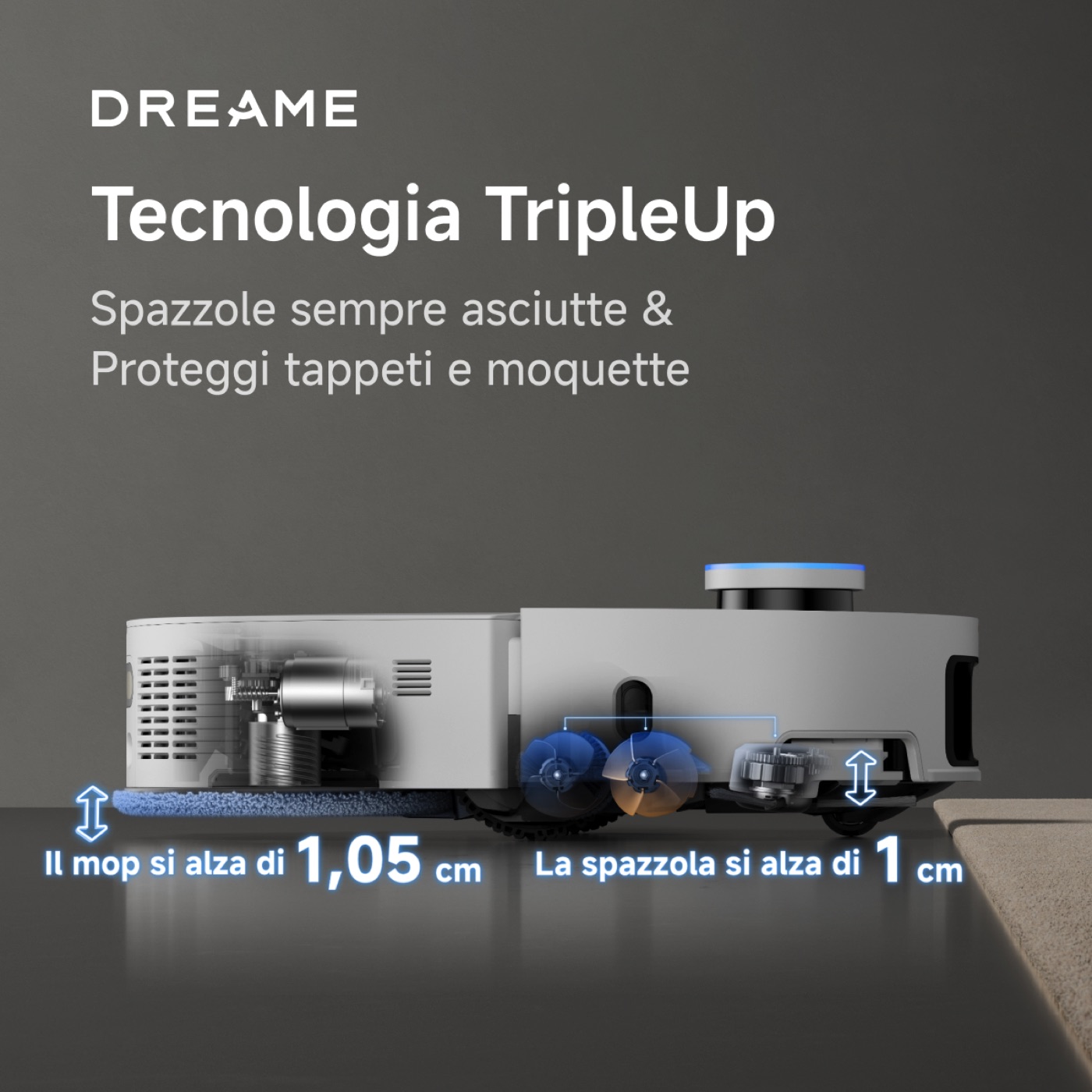 L’altra capacità di sollevamento, TripleUp, è quella relativa ai moci e e al sistema di pulizia rotante degli angoli che non è una novità ma è perfettamente integrato nei movimenti del robot in corrispondenza di tappeti di altezza fino