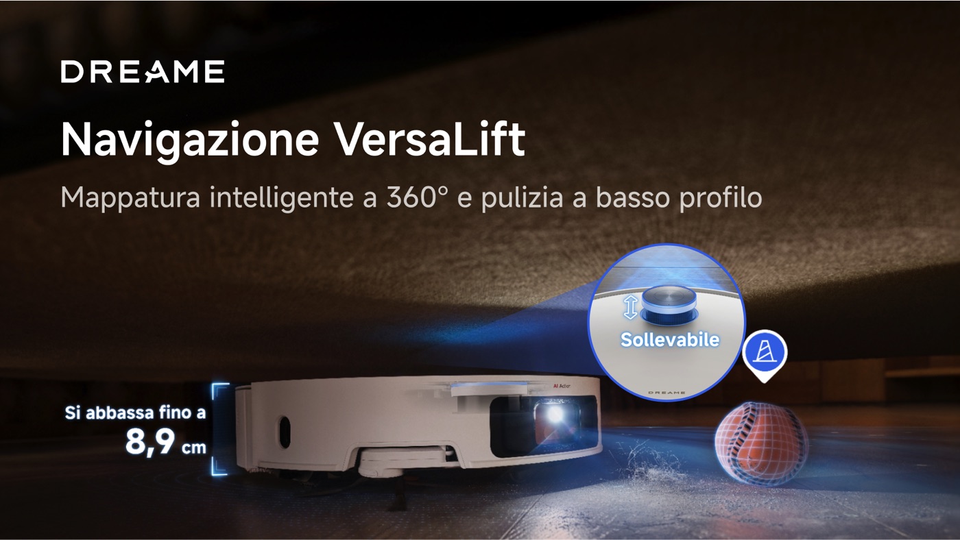 Il “pulisci sotto” si ottiene con un’altro geniale meccanismo: la torretta che include il sistema di misurazione della distanza (con sensore DToF – direct Time of Flight) è un elemento telescopico regolabile (VersaLift) e questo permette, alla bisogna, di ridurre l’altezza complessiva del Robot fino a 8,9 cm e questo gli permette di passare sotto i divani e i mobili più bassi e spostarsi anche sotto la maggior parte degli zoccoli delle cucine.