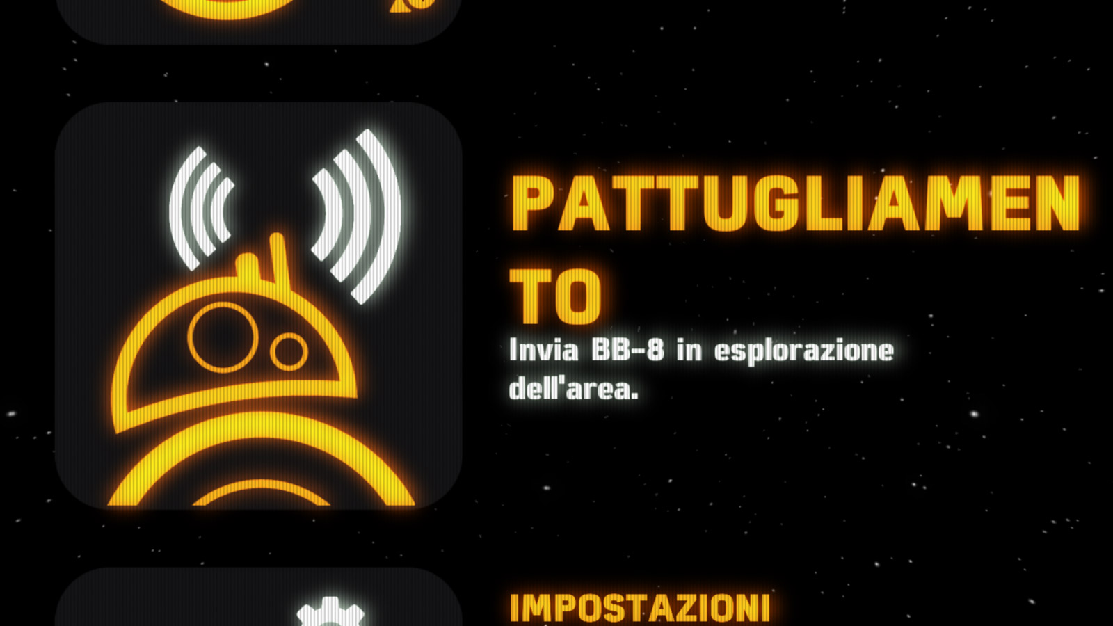 All’avvio, l’applicazione mostra quattro diverse schermate: Guida, Messaggio, Pattugliamento ed Impostazioni. In quest’ultima trovano posto alcune funzioni che si possono opzionalmente attivare o disattivare: tra queste è degno di nota l’interruttore relativo al riconoscimento vocale. Se attivato, sarà possibile controllare i movimenti del droide impartendo specifici comandi con la propria voce.