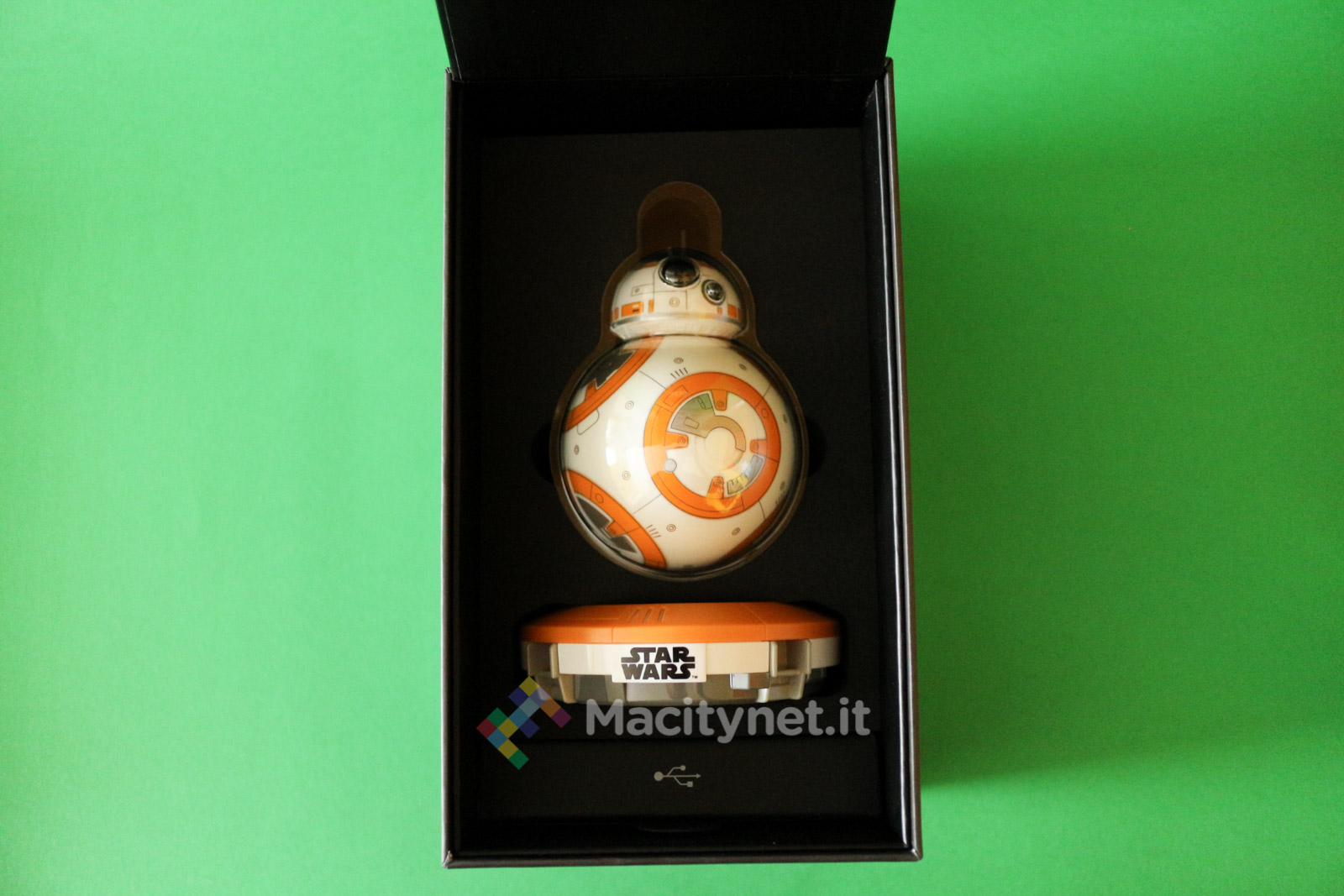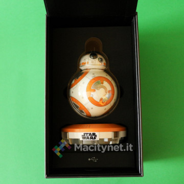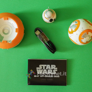 Nella scatola illustrata con tanto di logo della saga trovano posto il droide BB-8, opportunamente separato dalle due parti che lo compongono, una base per la ricarica in pieno stile intergalattico, un cavo microUSB con guaina gommata ed un breve manuale delle istruzioni, oltre ad un cartoncino che illustra graficamente i pochi e semplici passaggi da eseguire per la prima configurazione.