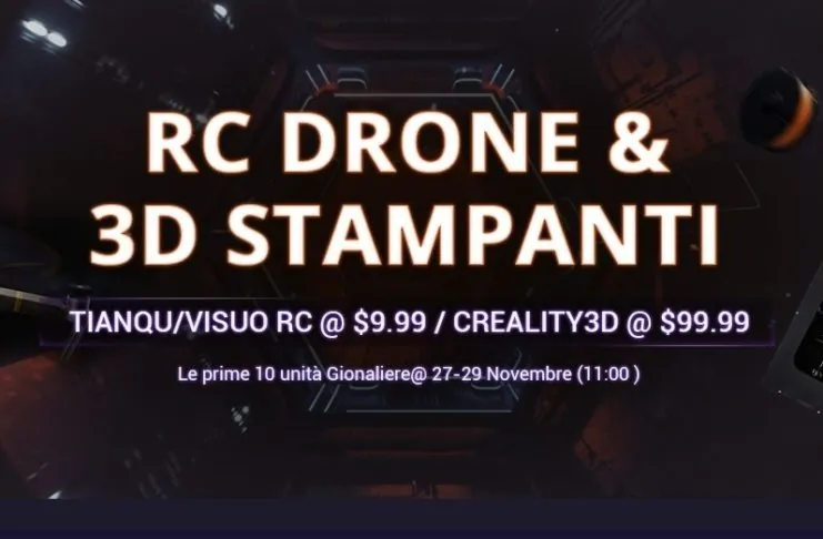Nuova tornata di offerte su GearBest che prosegue il suo evento iniziato per il Black Friday, proseguito con il Cyber Monday e che terminerà a fine mese. Questa volta saranno disponibili alcune interessanti offerte nel settore dei droni radiocomandati e delle stampanti 3D, con prezzi senza precedenti.