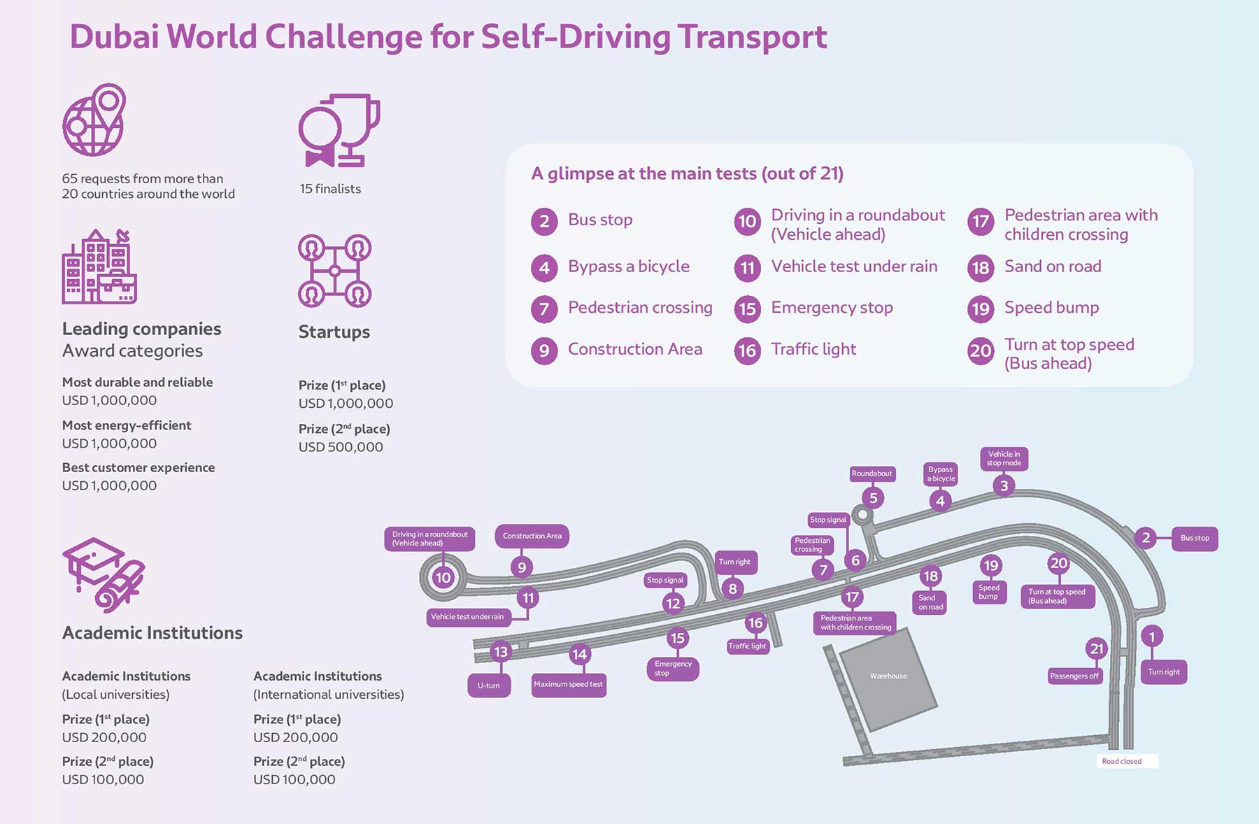 Il Dubai World Challenge per il trasporto a guida autonoma, ha messo in palio 5,1 milioni di dollari, attirando 54 soggetti da 20 diverse nazioni, 15 dei quali si sono qualificati alle finali. La sfida è incentrata su soluzioni legate al primo e all’ultimo miglio, per la cosiddetta mobilità sostenibile.