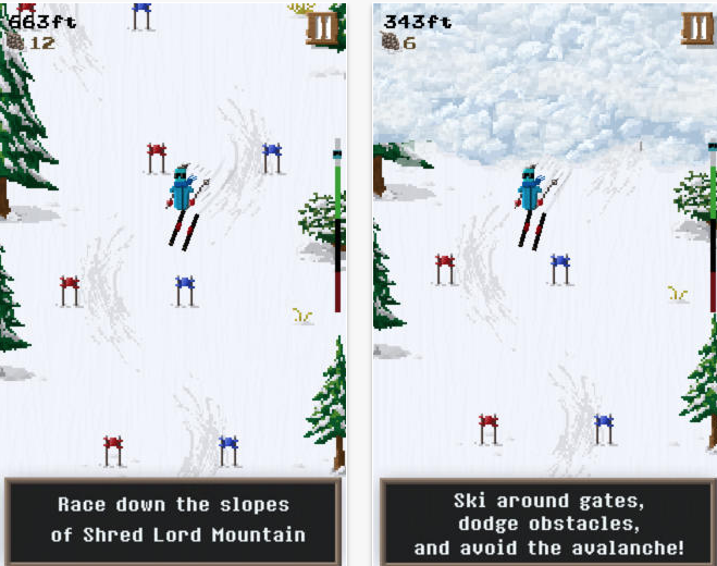 I livelli vengono generati in modo casuale, così che l’utente avrà la sensazione di percorrere sempre nuove piste, anche se a dire il vero lo sfondo, la disposizione degli ostacoli e degli elementi scenici daranno una sensazione di deja vu ad ogni discesa. È possibile anche sbloccare nuove piste, ma solo dopo aver collezionato un certo numero di pigne sparse per la pista. Le stesse possono essere usate anche come moneta di scambio per acquistare potenziamenti e migliorare la velocità dello sciatore o il proprio vestiario.