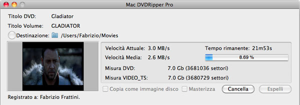 Una volta inserito il disco, si lancia MacDvdremaster Pro. L’applicazione è semplicissima nella sua struttura e molto diretto da usare; il suo compito è quello di leggere il disco e copiarlo nella sua interezza, inclusi menù e tutti gli extra. L’interfaccia nella parte sinistra ci presenta una finestra che con una serie di diapositive ci fa vedere a punto siamo della conversione, a destra ci fornisce una finestra con il progresso della lettura del disco sommata ad altre informazioni di base come il tempo rimanente, la velocità di lettura e la misura del DVD.