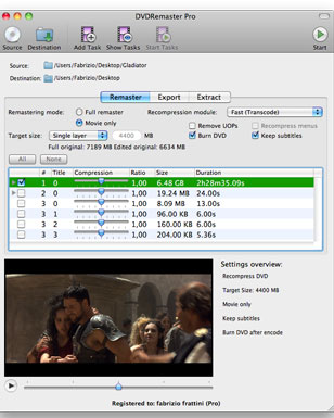 La nostra impressione dopo avere provato a fondo i due programmi è che si tratta di prodotti davvero molto interessanti che pur privilegiando la semplicità non perdono in potenza e flessibilità . MacDVDRemaster Pro nelle nostre prove è stato consistentemente superiore in termini di capacità di leggere e copiare dischi rispetto a tutti i prodotti della concorrenza, incluso il pur eccellente RipIt, brillando per velocità e per compatibilità anche con alcuni DVD recenti, indigesti ad altre applicazioni similari. DvdRemaster Pro ci ha impressionato per la quantità delle funzioni e per la velocità . Una cartella VIDEO_TS da quasi 8 Gb viene ridotta a 4 GB in circa un’ora e la funzione di masterizzazione o di esportazione in iTunes è altrettanto veloce e facile da usare, questo nonostante l’interfaccia sia in inglese.