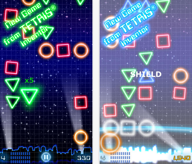 Dwice ricorda, già ad un primo impatto visivo, i vecchi giochi arcade, in quanto si serve di forme luminose al neon, che cadono dall’alto su una griglia di gioco, simile per certi aspetti a quella apprezzabile nel più classico dei Tetris. La città, che invece si intravede sulla parte bassa dello schermo ricorda la vecchia gloria intitolata Missile Command. In Dwice, c’è solo una modalità di gioco ed è davvero semplice ed intuitiva per ogni tipo di giocatore. Lo scopo di gioco è quello di raccogliere quante più forme geometriche dello stesso tipo e colore, senza mai staccare il dito dallo schermo. Per raggiungere il maggior punteggio combo possibile, ed evitare altresì che le forme al neon impattino con la città sottostante, l’utente dovrà trascinare le forme geometriche e colpire le altre dello stesso genere e colore, cercando di creare una catena più lunga possibile. Se si tocca una forma diversa il gioco finisce. Sembra abbastanza semplice, e almeno nelle meccaniche di base lo è. La difficoltà proviene, senza dubbio, dalla velocità sempre crescente con cui cadono dall’alto le varie forme geometriche.