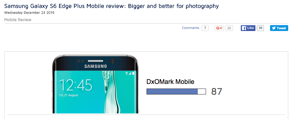 Nel complesso il voto assegnato da DxOMark per il Samsung Galaxy S6 Edge+ è di 87 su 100, a pari merito con il Sony Xperia Z5.