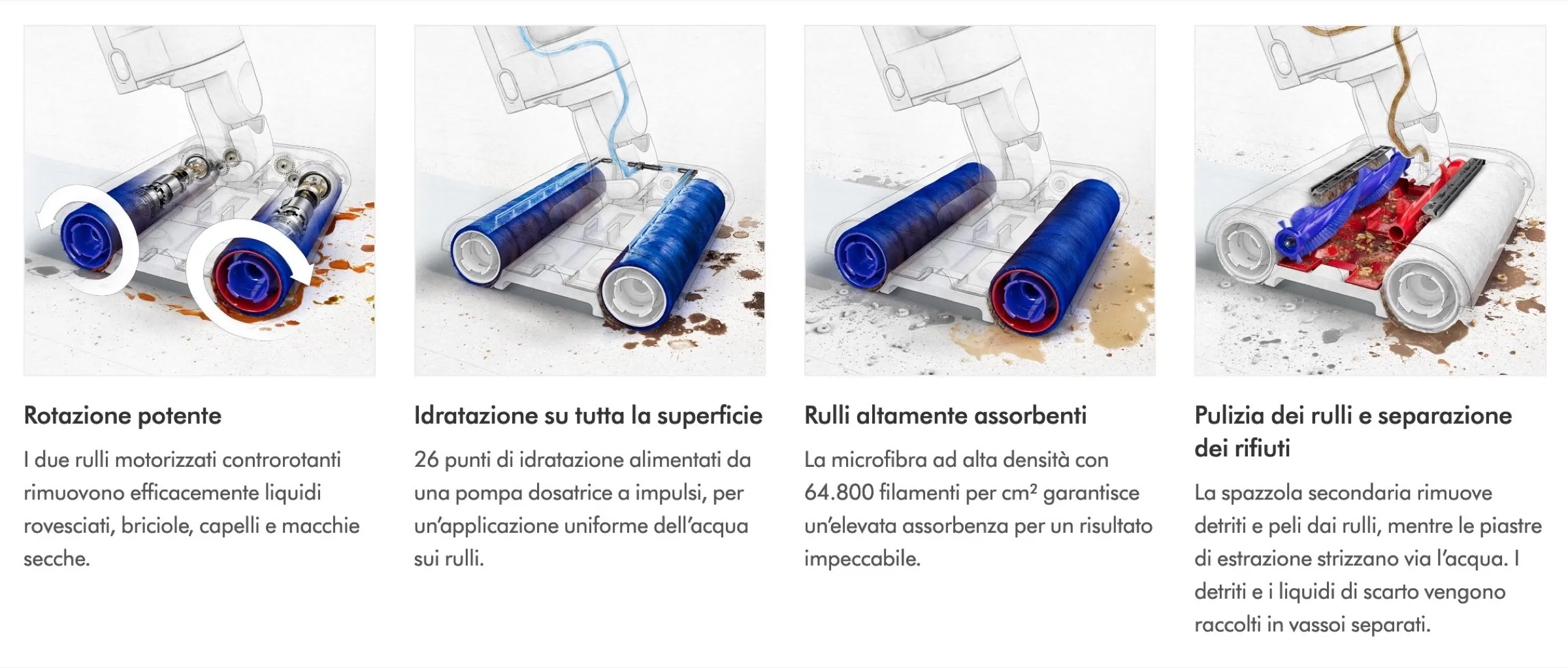 Secondo Dyson questo lavapavimenti è in grado di rimuovere le macchie con il 30% di passaggi in meno rispetto ai metodi tradizionali, contribuendo anche a un’asciugatura più rapida del pavimento (fino all’80% più veloce rispetto all’uso di un mocio). Altro elemento rilevante è l’assenza di filtri umidi, che nel tempo tendono ad accumulare batteri e odori.