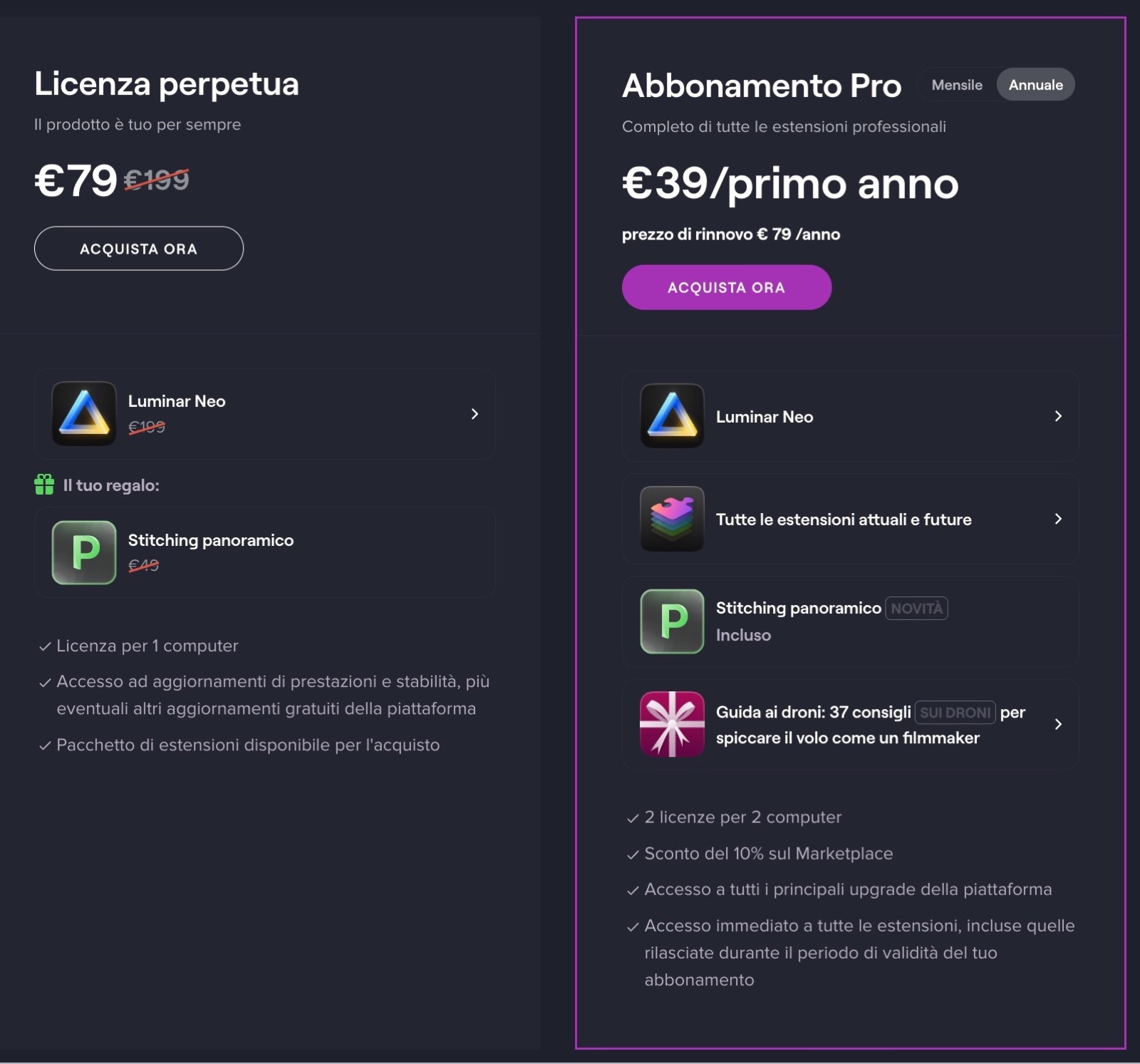 Se si opta per la licenza a vita il costo è di 79 € e comprende una licenza per Mac o PC di Luminar Neo, che generalmente costa 199 €, e l’estensione Stitching Panoramico che acquistata separatamente costerebbe 49 €, quindi si risparmiano 169 €.