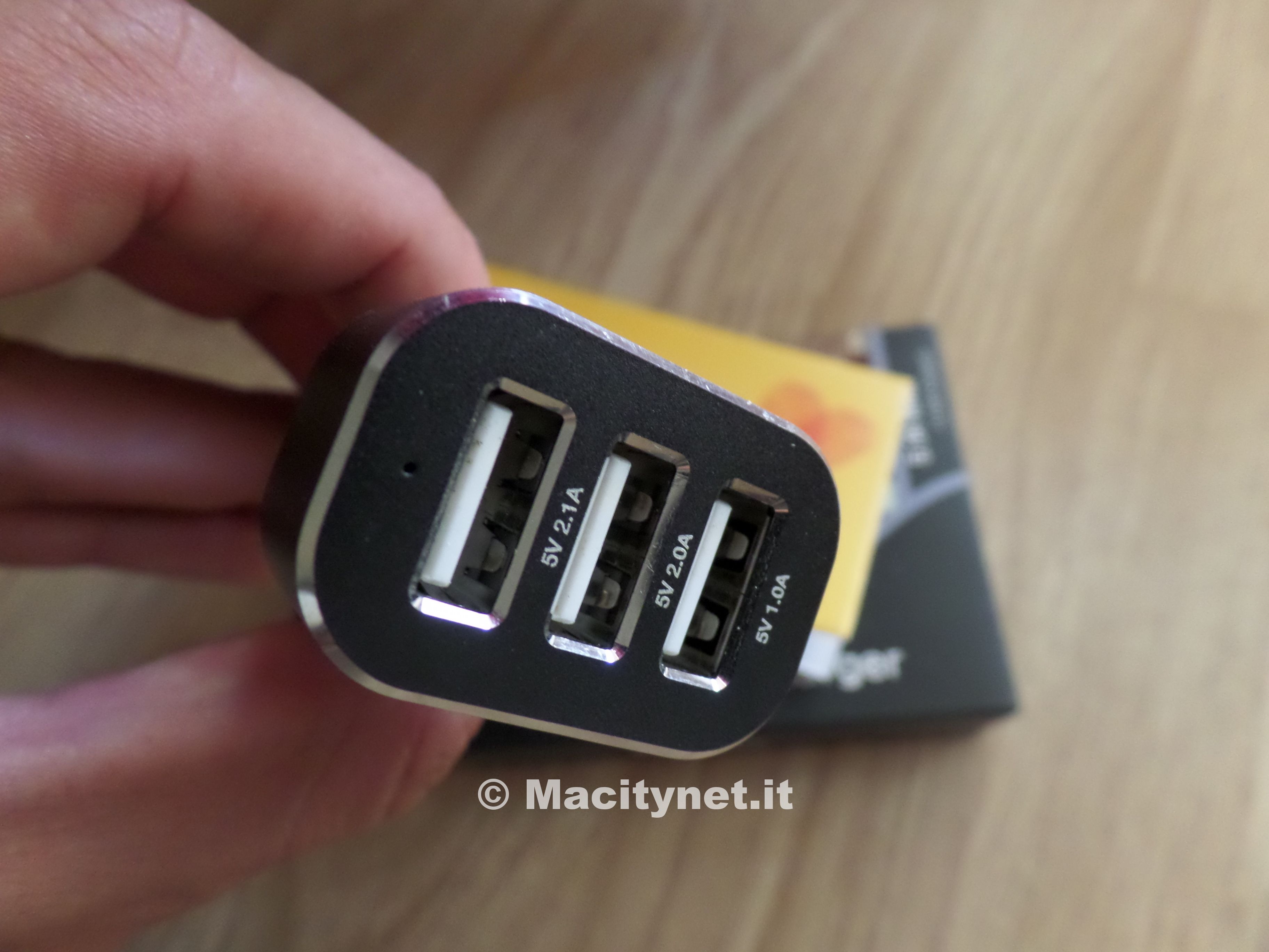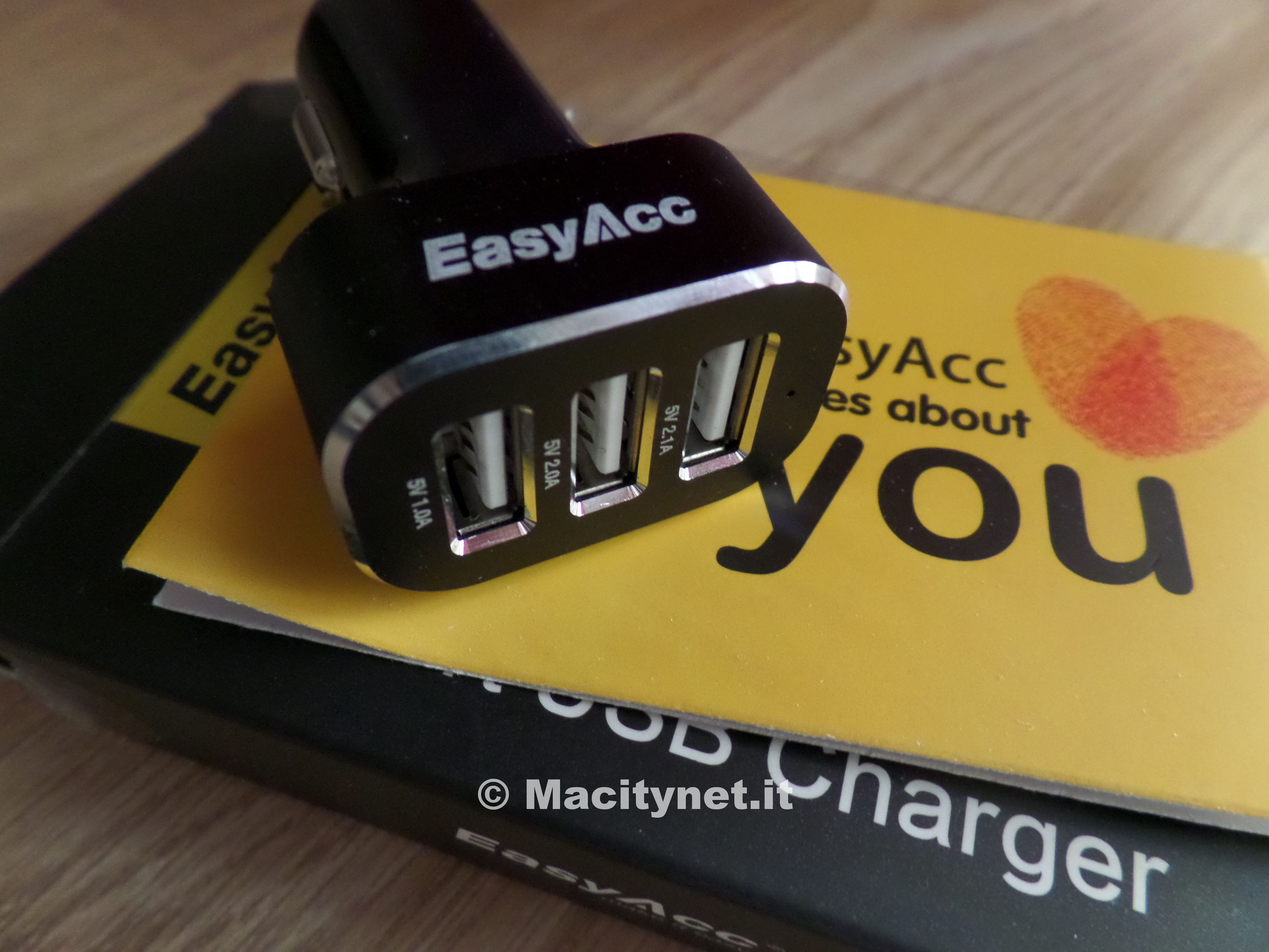 La vita sempre più frenetica di tutti i giorni, spesso, non consente di ricaricare iPhone, iPad, dispositivi Android o altri terminali, tramite la classica presa di corrente. Con l’autonomia di tutti questi dispositivi non sempre soddisfacente, una buona soluzione potrebbe arrivare dagli alimentatori da auto, che anche nei piccoli spostamenti possono risultare utili per alimentare, e perché no ricaricare, il terminale di una buona percentuale. Ancor più utile, se il caricabatterie da auto presenta più di una porta USB. Quello testato da Macitynet, di EasyAcc presenta non una, non due, bensì tre differenti porte USB, da 1A, 2A e 2.1A,  in grado di fornire, complessivamente, 5.1A di potenza e quindi di ricaricare contemporanemente due iPad e un iPhone.