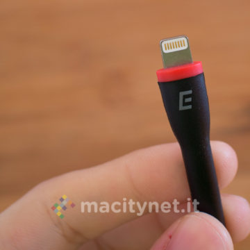 Nei connettori c’è un rinforzo in plastica, riconoscibile anche dall’anello di colore rosso che viene in parte mostrato proprio in prossimità delle spine. Quella Lightning è abbastanza spessa, ciò significa che potrebbe non sempre essere possibile collegarlo su iPhone e iPad che utilizzano custodie piuttosto ingombranti, anche se durante le nostre prove siamo riusciti a collegarlo anche ad un iPhone munito di una custodia shockproof. L’irrobustimento in plastica è tale da assicurare un’elevata resistenza alle giunture, il punto debole dei cavi che solitamente finiscono smettono di funzionare proprio a seguito di una rottura del cavo ad una delle estremità.