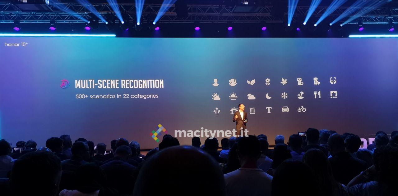 Anzitutto il reparto multimediale. Honor 10 è dotato di Fotocamera AI 2.0, con la camera principale da 24MP + 16MP. Non solo tanti MP, ma anche la tecnologia AI che riconosce più di 500 scenari in 22 categorie diverse in tempo reale. Può individuare i contorni di vari oggetti circostanti, come il cielo, piante, persone o anche una cascata, e identificare le loro posizioni istantaneamente.