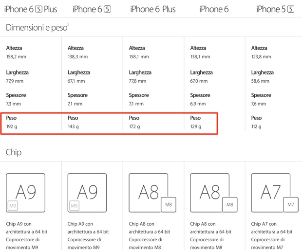 Chi ha avuto modo di toccare con mano i nuovi iPhone 6s al Keynote di Apple del 9 settembre sostiene che l’incremento di peso è davvero contenuto ma ciò nonostante risulta avvertibile: non comporta nessun problema nell’utilizzo quotidiano. Molti utenti potranno rendersene personalmente conto impugnando un nuovo iPhone 6s in una mano e il precedente iPhone 6 nell’altra. Si tratta di un incremento di peso nell’ordine del 10-11%: il nuovo iPhone 6s pesa 14 grammi in più del modello precedente, mentre iPhone 6s Plus pesa 20 grammi in più, così come chiaramente indicato nelle specifiche tecniche pubblicate da Apple.
