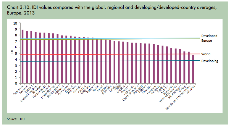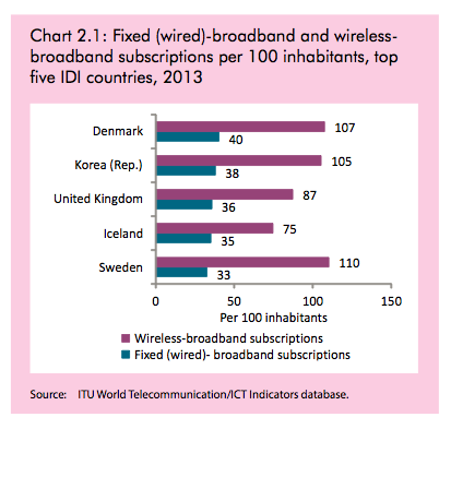 Secondo l’indice ICT Development Index, parte del MIS Report 2014 (che si scarica gratuitamente e integralmente da qui) – uno strumento per misurare la società dell’informazione nel mondo elaborato e presentato dall’Unione internazionale delle telecomunicazioni – figurano come le economie con un migliore e più diffuso accesso alle tecnologie di comunicazione e di rete nel mondo quelle degli stati del Nord Europa – in vetta la Danimarca, seguita a ruota da Korea, Svezia, Islanda, Gran Bretagna, e poi da Olanda, Norvegia, Finlandia, Lussemburgo, Hong Kong, Giappone e Australia. In questi Paesi, la copertura wireless è estesissima e sono molti i servizi pubblici ai quali ci si può connettere senza necessariamente affrontare ore di coda agli sportelli.