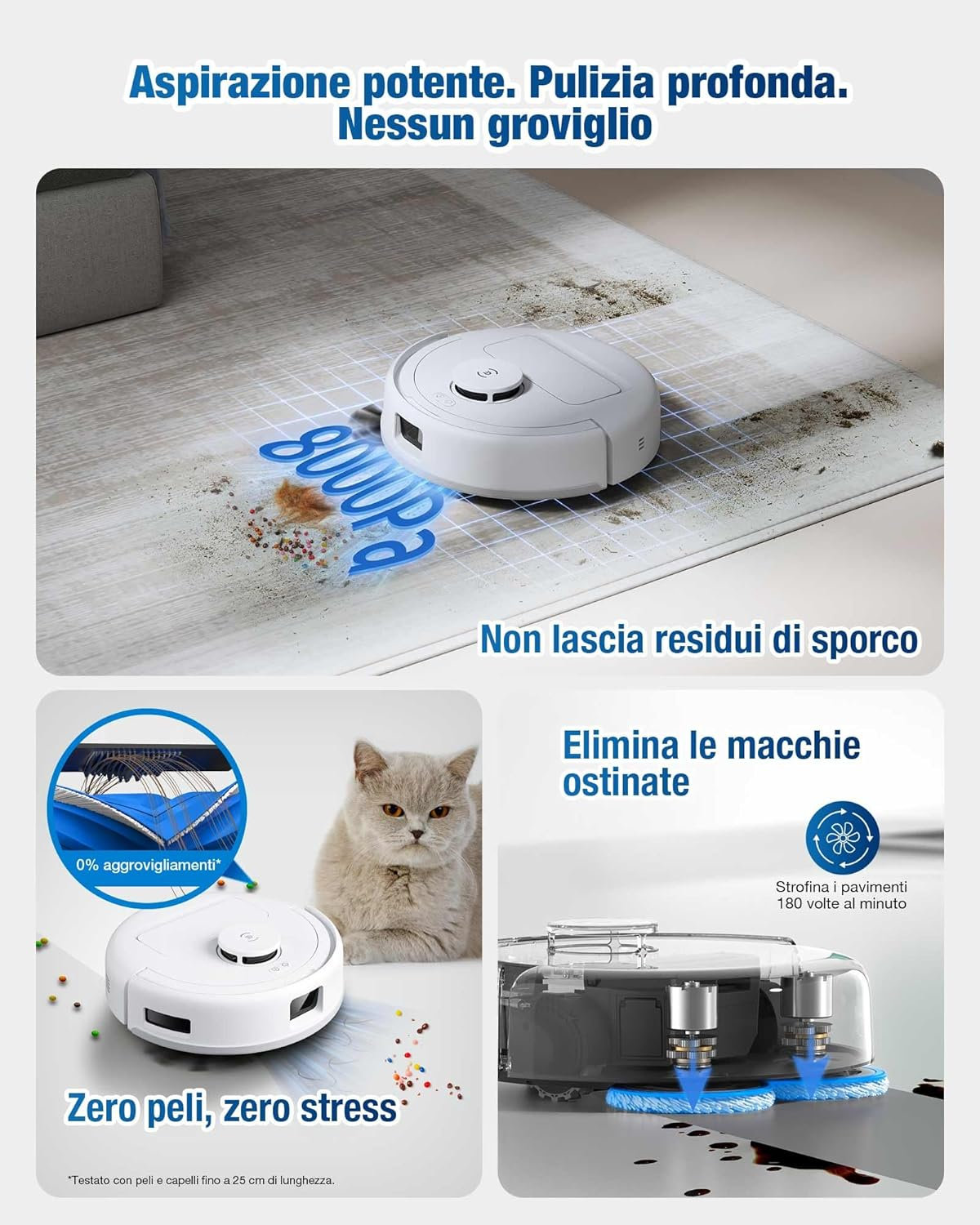La potenzia di aspirazione di 9.000 Pa assicura pulizia profonda contro sporco, polvere e detriti sia su tappeti che pavimenti. Per il lavaggio sfrutta il sistema Ozmo Turbo 2.0 Rotating Mopping a doppia piastra ad alta pressione per pulizia di livello professionale, per pavimenti puliti e brillanti. Nessun problema se in famiglia ci sono abitanti con capelli lunghi e animali grazie alla tecnologia ZeroTangle 2.0 aggiornata.