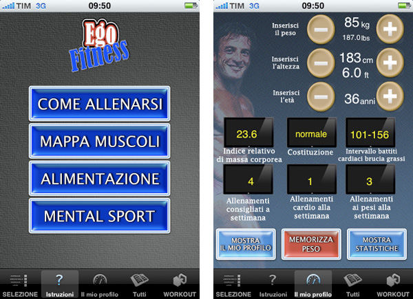 Dimentichiamo la solita ripetitiva tabella di allenamento non più in grado di stimolare i nostri muscoli e nemmeno il nostro interesse, diete improvvisate ed esercizi eseguiti approssimativamente. Il programma EgoFitness trasforma iPhone/touch in un vero e proprio allenatore personale, completo e competente: già  descritto da Macitynet è ora disponibile nella nuova versione 1.3. Il software è diviso in quattro sezioni principali: allenamento, mappa dei muscoli, alimentazione e la nuova mental sport. A seconda del sesso, dell’età , del peso e alle nostre preferenze personali per quanto riguarda il tipo di allenamento e i gruppi muscolari, EgoFitness offre una serie infinita di tabelle di allenamento sempre diverse e stimolanti. Tutti gli algoritmi integrati nel programma sono stati realizzati in base alle conoscenze e ai consigli di Leo Caminotto, pluricampione italiano di body building, due volte campione europeo e vice Mister Universo.
