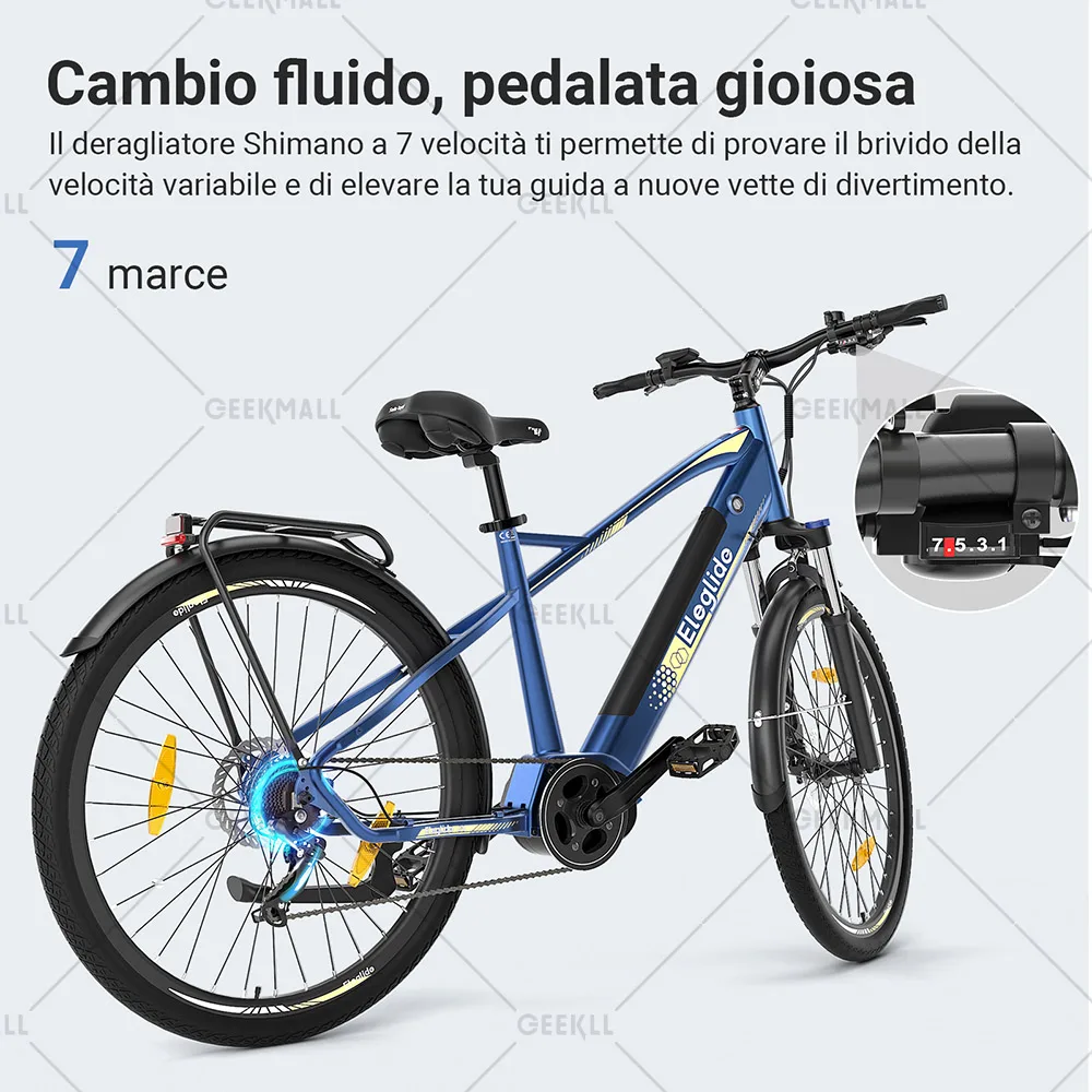 Eleglide C1 ST propone un motore centrale da 250W, ruote da 27,5″, batteria da 522Wh e autonomia fino a 150 km con pedalata assistita. Il motore centrale da 250W garantisce un’ampia autonomia e una coppia elevata, rendendo la pedalata più agevole.
