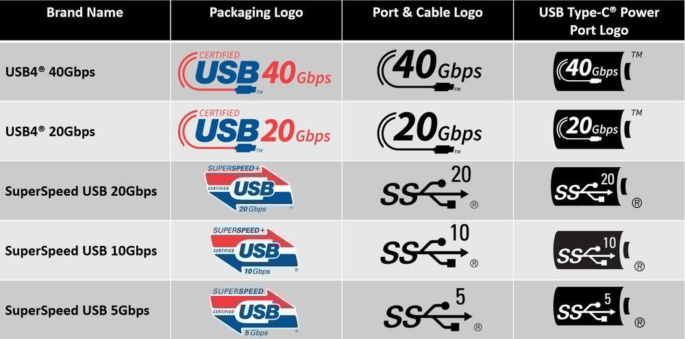 L’USB Implementers Forum (USB-IF) ha predisposto vari logotipi per far comprendere meglio il tipo di cavo con cui si ha a che fare, ma la loro indicazione non è obbligatoria e questi – oltre a essere spesso minuscoli – riportano in ogni caso l’indicazione della velocità solo quando supera i 480 Mb/s.