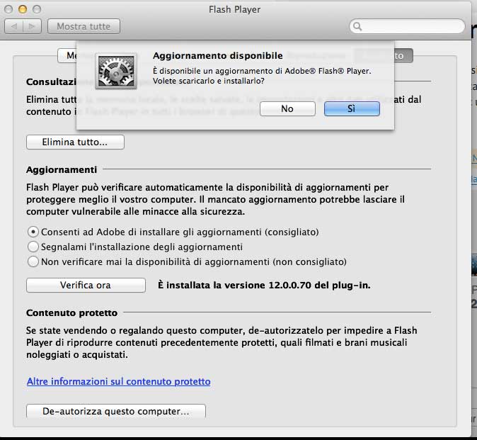 Se avete già installato una release recente del player, l’update può essere scaricato selezionando “Flash Player” dalla Preferenze di Sistema, facendo poi click su “Verifica Ora” nella sezione “Avanzato”. Dopo la verifica dell’update partirà e verrà installato l’aggiornamento alla versione 12.0.0.77. In alternativa il Flash Player può essere scaricato in versione completa da questo indirizzo. Il player integrato nel browser Chrome è aggiornato automaticamente.