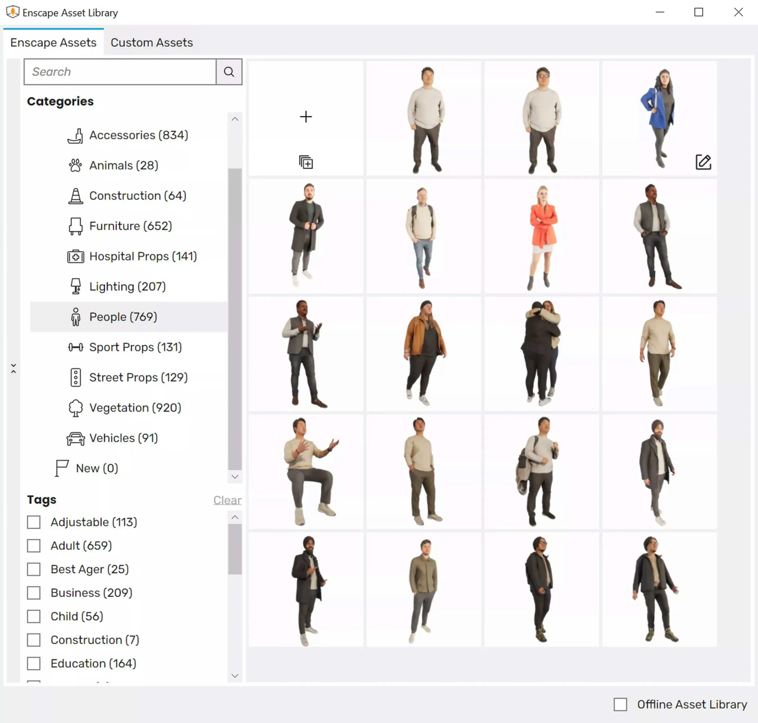 La libreria delle risorse di Enscape include trentadue personaggi per aiutare gli architetti ad aggiungere un entourage realistico agli ambienti 3D. Con una varietà di posizioni, abiti e accessori diversi tra cui scegliere, è possiibile illustrare rapidamente la funzione e le sensazioni di uno spazio per clienti e colleghi.