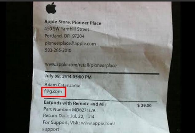 E’ successo presso l’Apple Store di Portland: Adam Catanzarite si recato presso il negozio della Mela per acquistare un paio di Earpod; una volta uscito dallo store ha però notato che sul suo scontrino, nello spazio solitamente dedicato all’indirizzo email del cliente, era segnalato l’indirizzo “[email protected]”. ‘Fag’ è l’abbreviazione di ‘faggot’, termine utilizzato in Nord America per rivolgersi in maniera dispregiativa ad una persona omosessuale. E’ probabile che l’acquirente si sia rifiutato di fornire l’indirizzo email all’addetto alle vendite dell’Apple Store, probabilmente per motivi di privacy; il campo relativo all’email deve quindi essere stato completato momentaneamente dal personale del negozio, che si è poi dimenticato di modificare l’indirizzo ingiurioso prima della stampa dello scontrino.