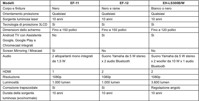 Epson EF-11 ed EF-12 sono i più piccoli videoproiettori laser 3LCD di Epson, con dimensioni, rispettivamente, di 175 x 65 x 175 mm e 175 x 135 x 175 mm, per un peso rispettivamente di 1,2 kg e 2,1 kg. Propongono una luminosità di 1.000 lumen, e possono essere spostati facilmente da una stanza all’altra o portati anche a casa di amici.