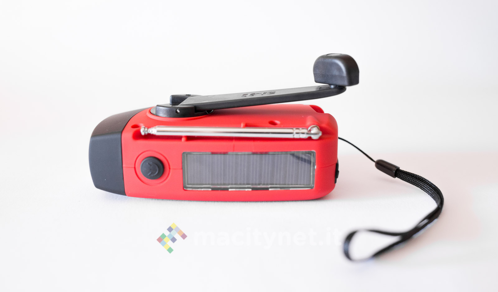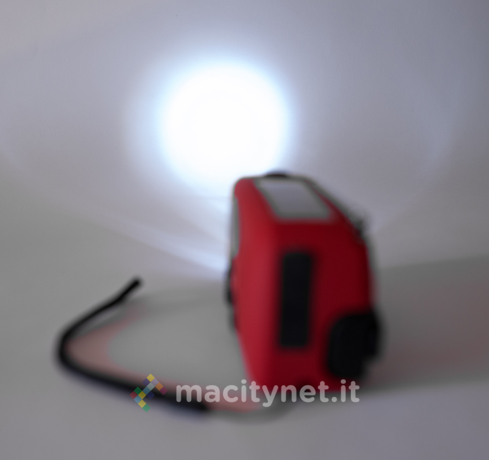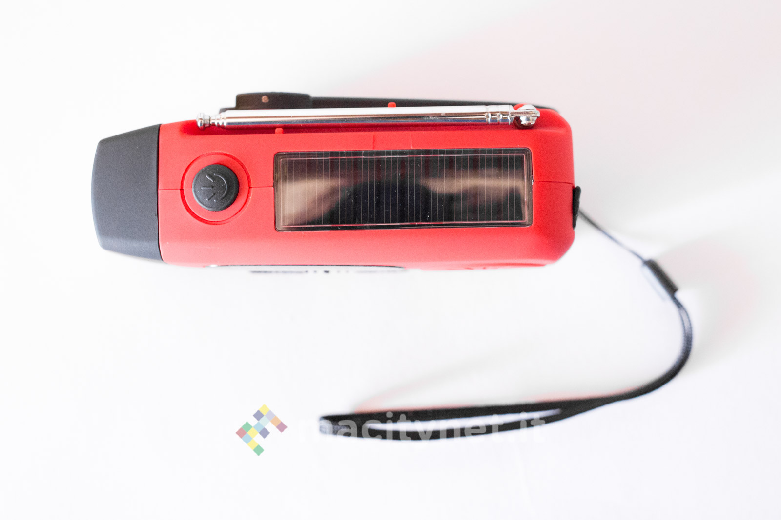 Sulla facciata frontale c’è l’altoparlante, le manopole e i pulsanti per gestire la radio, compreso il pannello analogico che mostra la frequenza selezionata. Sul bordo superiore c’è il pannello solare, il pulsante di accensione della torcia (tre luci LED incassate nel bordo anteriore) e l’antenna telescopica in metallo per migliorare la ricezione della radio.