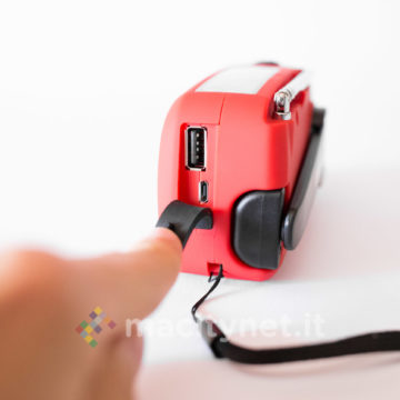 “Con il proprio sudore” – Se il cielo è nuvoloso oppure è notte inoltrata e non c’è una presa nei paraggi, ci si può affidare alla dinamo. E’ sufficiente estrarre la manopola e ruotarla per qualche minuto per raccogliere energia sufficiente per ascoltare circa 10 minuti di radio. In numeri, 130 giri in un minuto equivalgono anche a pressapoco 3 minuti di luce continua con la torcia.