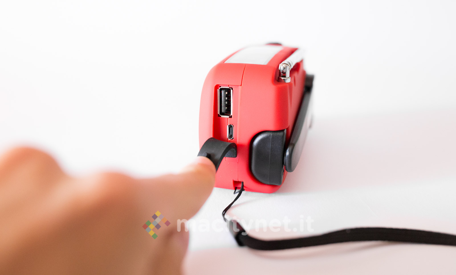 Dietro è incassata la manopola per la dinamo mentre sul bordo inferiore, mentre sul bordo posteriore c’è l’ingresso microUSB per la ricarica della batteria interna e l’uscita USB per sfruttare l’energia del 3-in–1 per ricaricare uno smartphone. Entrambe le prese sono protette da un ampio tappo in gomma che assicura una buona impermeabilità del prodotto.