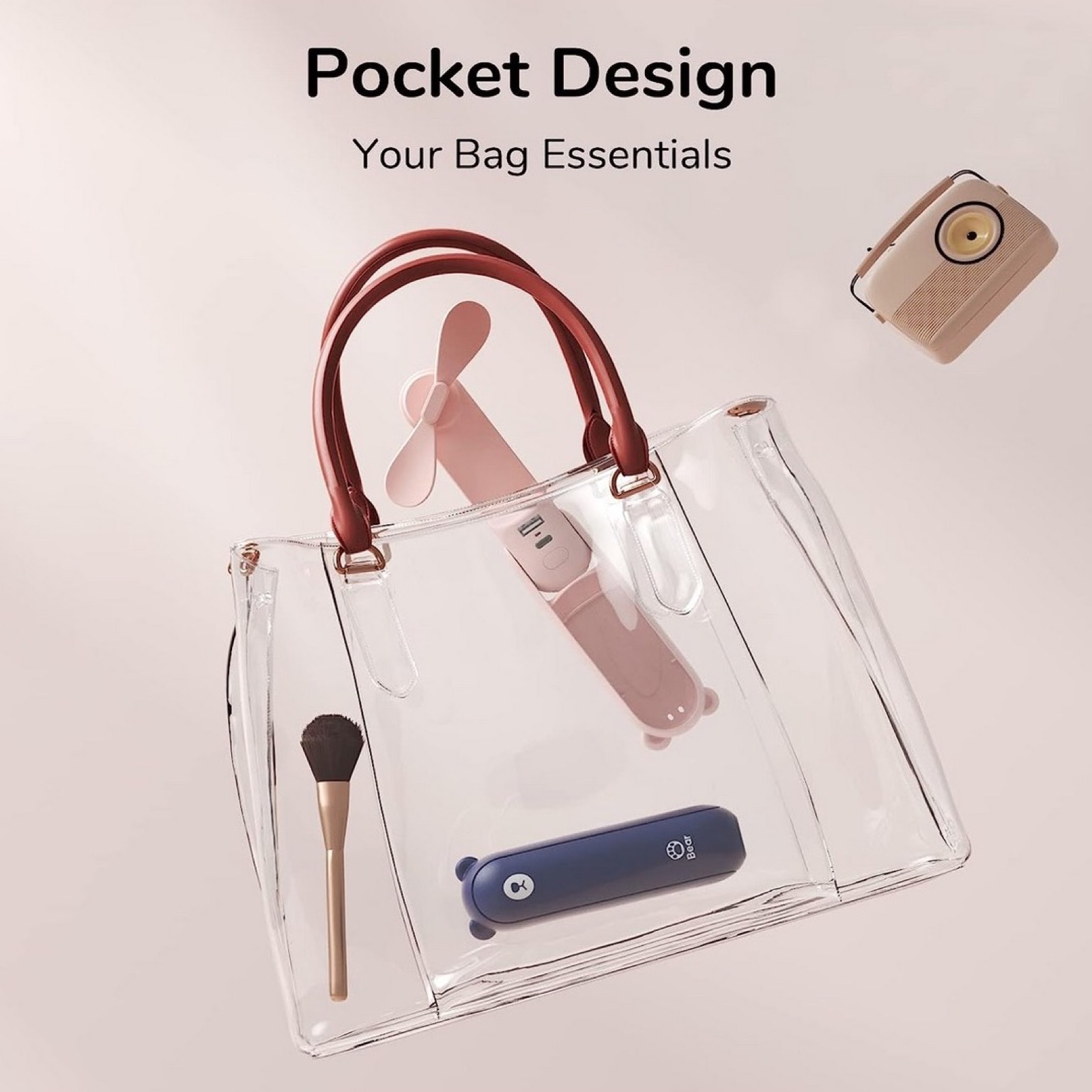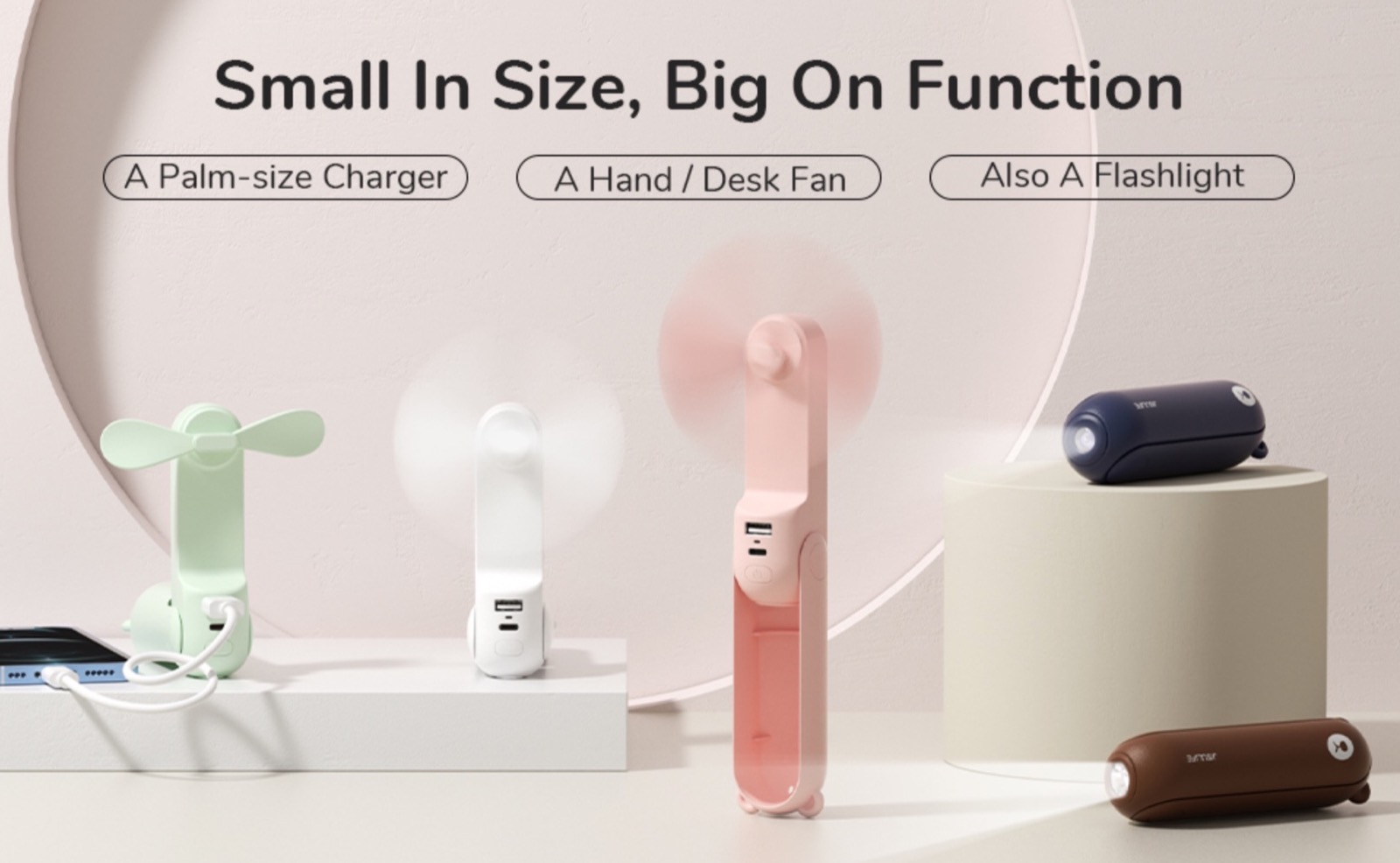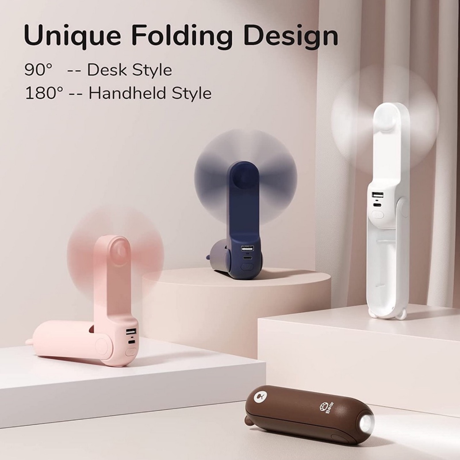 La sua forma infatti è progettata per poterlo facilmente impugnare ad esempio quando si cammina, si sta in piedi o ci si sposta in autobus o in metro, ma il manico può essere anche piegato a 90° in modo da appoggiarlo su qualsiasi tavolino e quindi avere un piccolo ma efficiente sistema rinfrescante per scuola, lavoro, ufficio, conferenze e via dicendo.